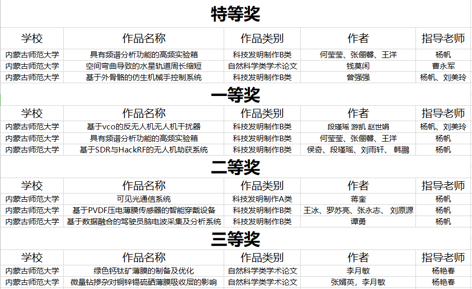 第十一届“挑战杯”全区大学生课外学术科技作品竞赛结果揭晓,物理与电子信息学院学生的11件作品在此次竞赛中获奖。其中,特等奖3个、一等奖3个、二等奖3个、三等奖2个,我院党总支副书记兼副院长张伟获“优秀工作者”称号。具体获奖人、获奖人项目及其指导老师名单如下: