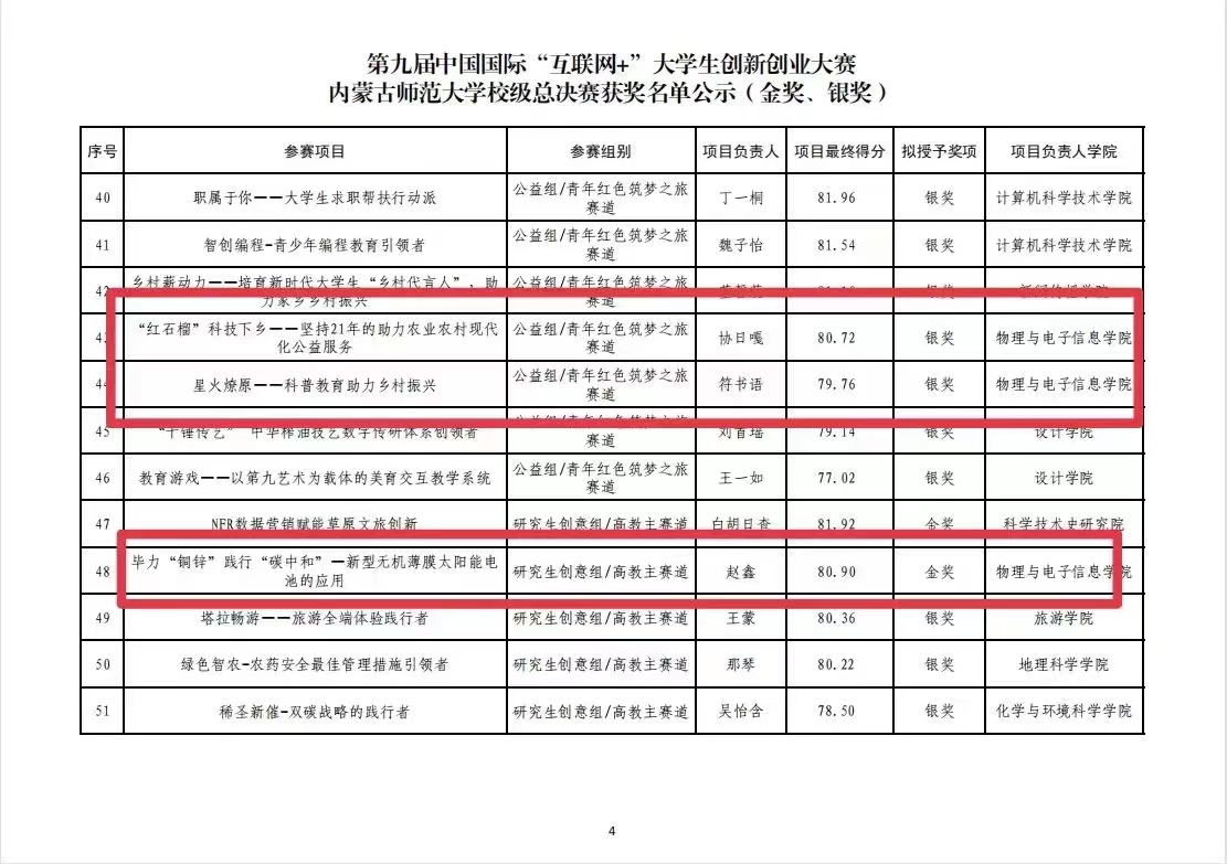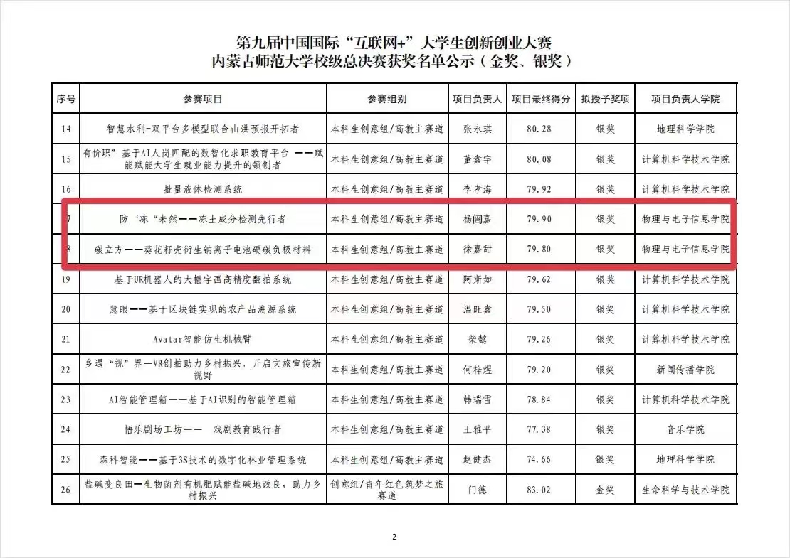 7月4日,第九届“互联网+”大学生创新创业大赛校赛决赛结束,我院摘得了三金四银的好成绩,其中“草立方——牧草补光生长方案开拓者”、“碳求真理,碳缩未来”、“'毕力'铜锌践行'碳中和'——新型无机薄膜太阳能电池的应用”获得高教主赛道本科生、研究生创意组金奖,“防'冻'未然——冻土成分检测先行者”、“碳立方——葵花籽壳衍生钠离子电池硬碳负极材料”获得高教主赛道本科生创意组银奖,“'红石榴'科技下乡——坚持21年的助力农业农村现代化公益服务”、“星火燎原——科普教育助力乡村振兴”取得了青年红色筑梦之旅公益组银奖。
