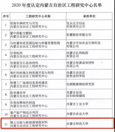本网讯 日前,内蒙古自治区发展和改革委员会公布了内蒙古自治区工程研究中心名单,全区获批11家。我校依托物理与电子信息学院申报的稀土功能与新能源储能材料内蒙古自治区工程研究中心成功获批。