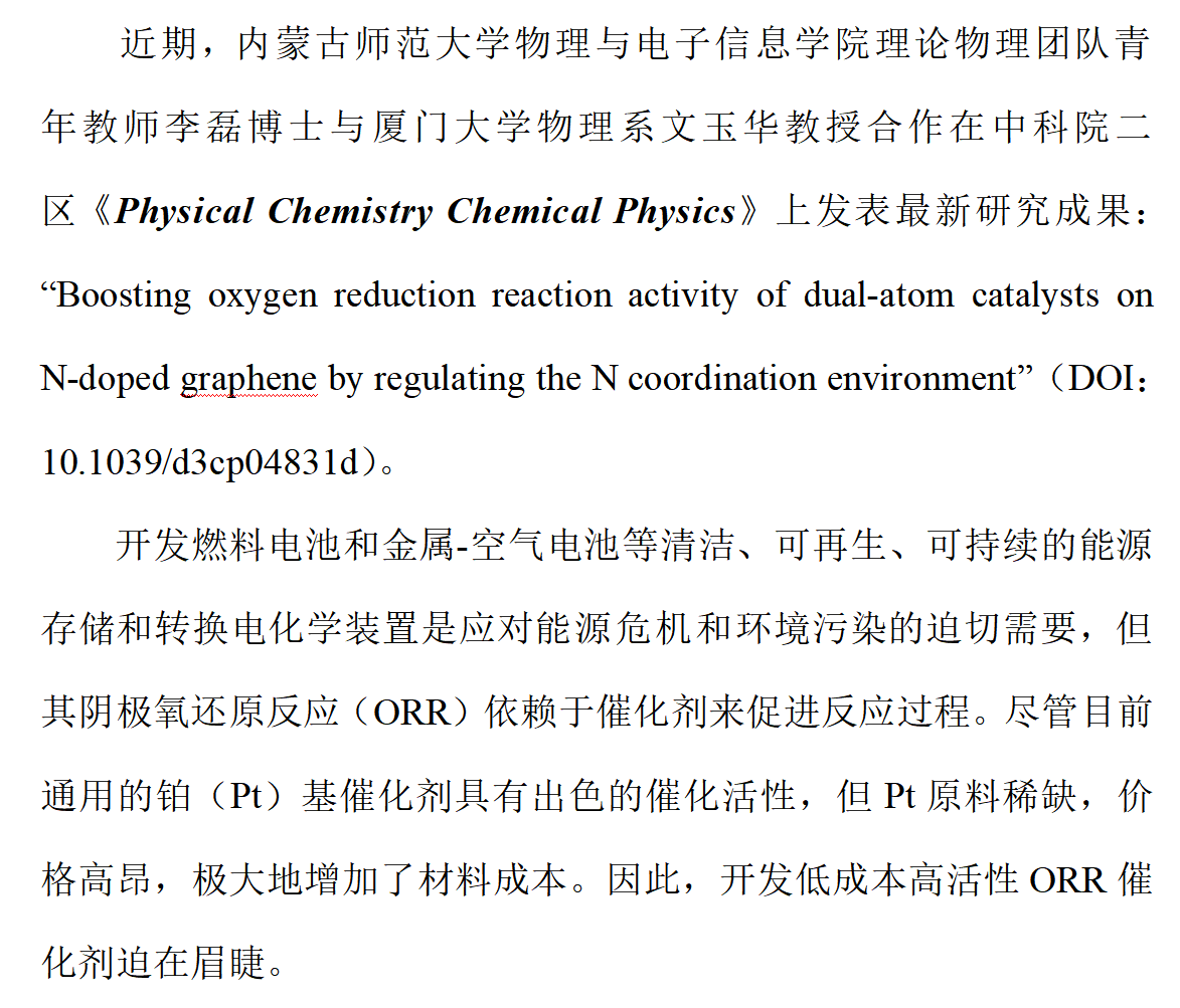 【科研快讯】我院理论物理研究团队李磊老师在《Physical Chemistry Chemical Physics》发表研究成果