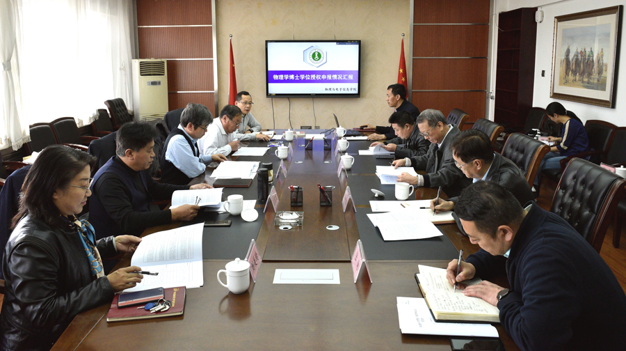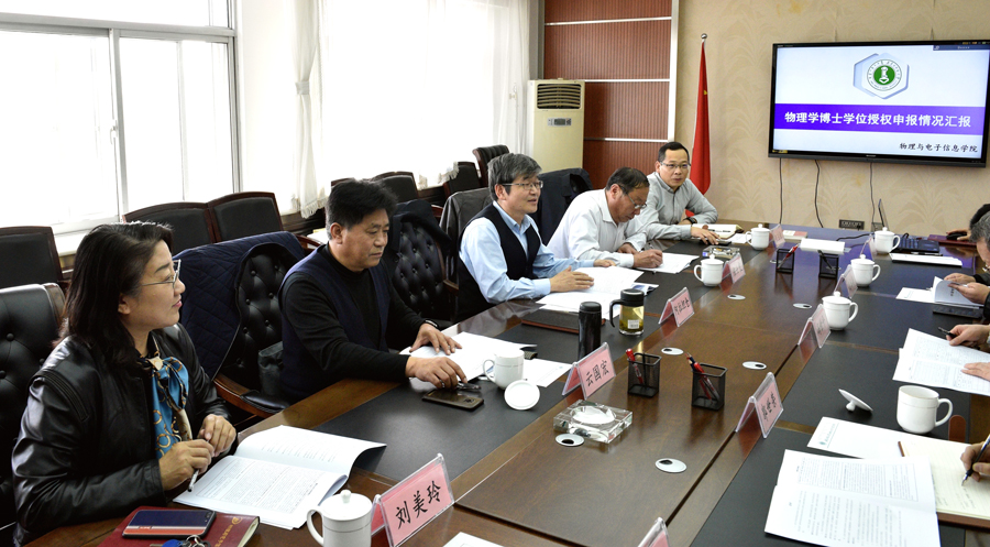 首先,曹永军副院长分别从物理学专业研究方向、学术团队、人员规模、队伍建设和人才培养等方面进行了汇报,认真分析了了物理与电子信息学院申请博士学位授权学科点的必要性、专业特色及其优势。各位专家对照评审基本条件,各抒己见,出谋划策,从凝练学科特色、队伍建设、研究成果等方面对学院申博材料进行了点评。专家肯定了学院的申博工作,对于学院的申博条件给予了认可,对申报材料填报中存在问题提出了中肯意见,并指出了下一阶段的工作重点。