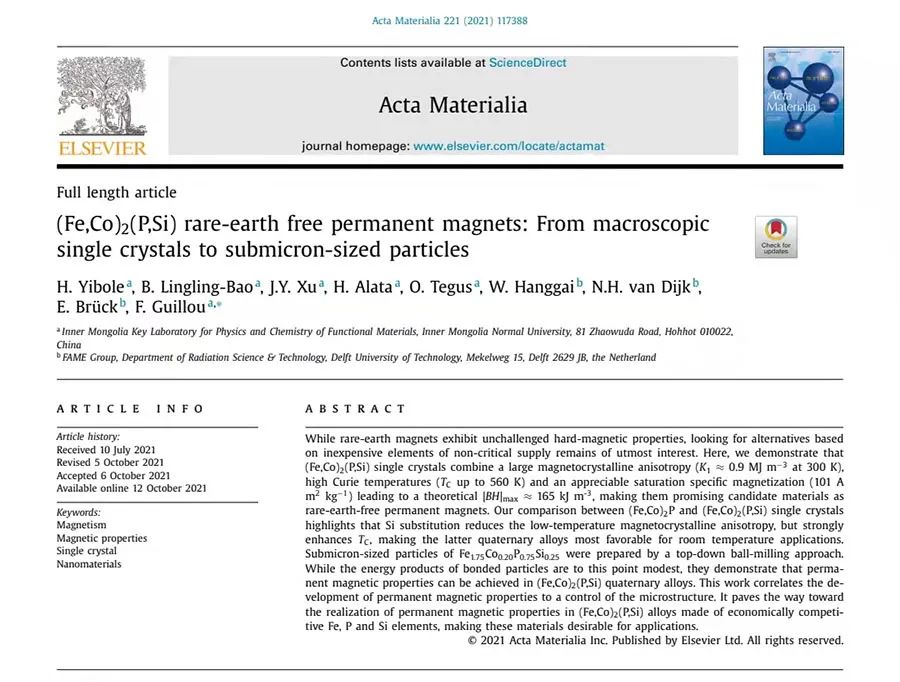 物理与电子信息学院凝聚态物理课题组与荷兰代尔夫特理工大学(TU Delft)合作,在探索新型无稀土永磁材料方面取得重要突破。其研究成果“(Fe,Co)2(P,Si) rare-earth free permanent magnets: From macroscopic single crystals to submicron-sized particles”在国际学术期刊《Acta Materialia》(A类TOP期刊,影响因子: 8.203)上发表。论文以内蒙古师范大学为通讯单位,第一作者是物理与电子信息学院伊博乐副研究员,其他成员依次为包玲玲(研究生)、徐静阳(研究生)、阿拉塔副研究员、特古斯教授、杭盖(代尔夫特理工大学在读博士)、代尔夫特理工大学的Niels van Dijk副教授和Ekkes Brück教授、Francois Guillou研究员(通讯作者)。这是我校首次以第一作者和通讯作者单位在国际学术期刊《Acta Materialia》上发表学术论文。