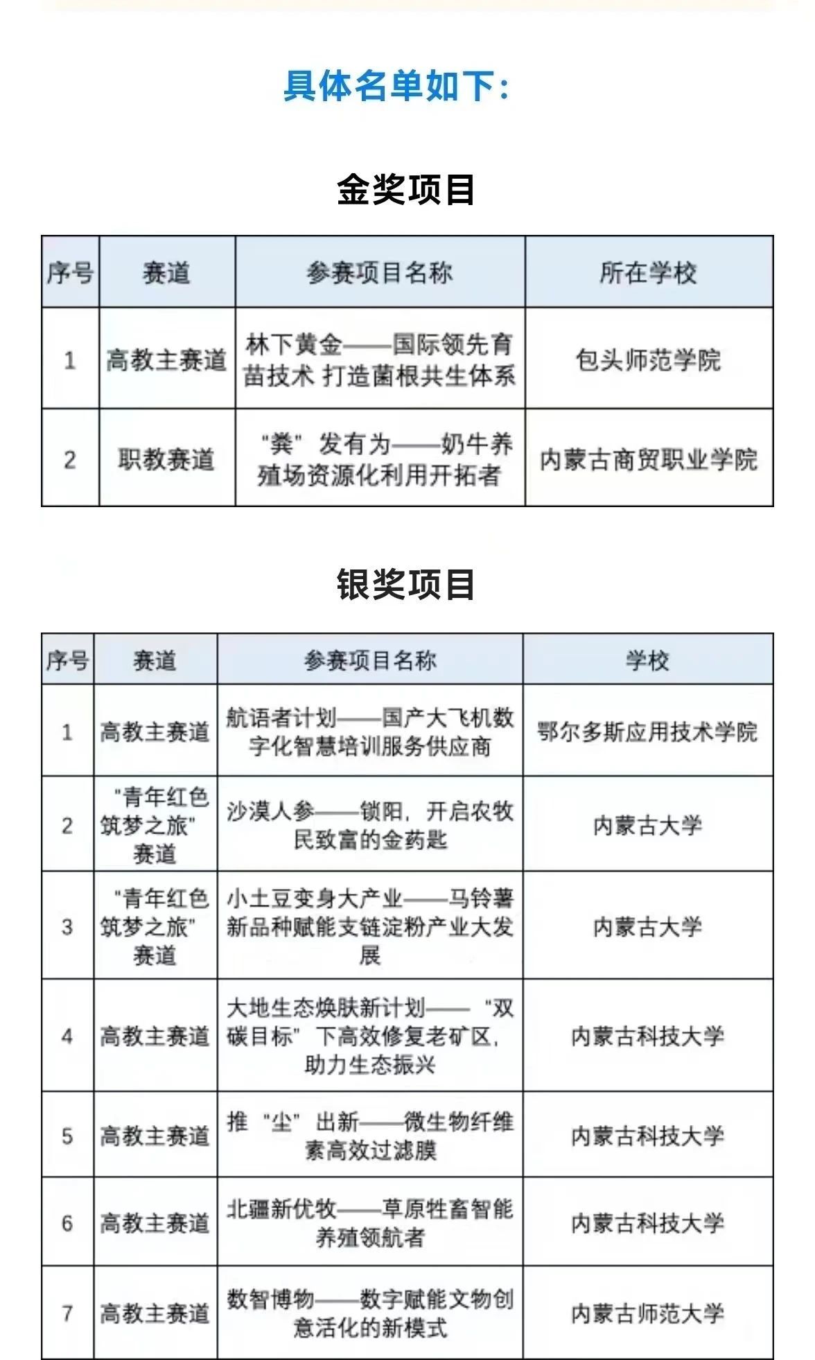 11月11日至13日,第八届中国国际“互联网+”大学生创新创业大赛以线上形式在重庆大学举办,我区共有10个项目参加角逐。11月21日,大赛组委会正式公布总决赛成绩,我院选送的“科技下乡——坚持20年的助力农业农村现代化公益服务”获得“青年红色筑梦之旅”赛道铜奖,该项目由张伟、宝力尔老师指导;“全光谱照明用荧光材料开发和应用技术”获得产业命题赛道铜奖,该项目由朝克夫、那日苏老师指导。两项目的获奖,实现了我院在互联网+赛事上国赛获奖零的突破。
