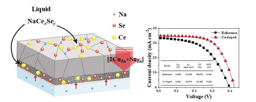 缺陷工程的调控是改善铜锌锡硫硒(Cu2ZnSn(S,Se)4)薄膜太阳能电池性能的关键。杨艳春副教授带领的“无机薄膜太阳能电池课题组”一直致力于溶液法制备铜基太阳能电池及其性能优化等方面的研究。近期,该团队首次报道了稀土阳离子Ce3+额外掺杂对Cu2ZnSn(S,Se)4电池性能的影响,通过对Ce3+掺杂的Cu2ZnSn(S,Se)4材料和电池器件的研究,发现掺入的Ce形成NaCexSey,分布于Cu2ZnSn(S,Se)4薄膜的表面和中间小晶粒层,可以抑制与Sn相关的有害缺陷,提高开路电压,最终将电池效率由6.77 %提高到9.14 %,为Cu2ZnSn(S,Se)4的缺陷调控和电池优化提供了新的见解。