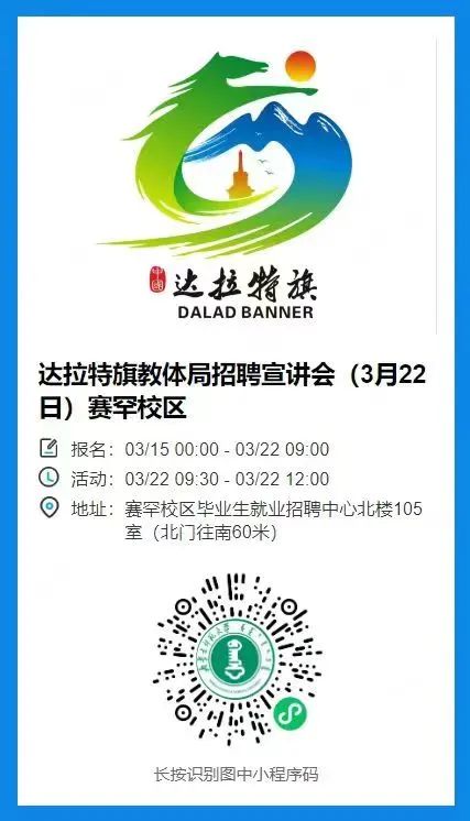 【就业信息】鄂尔多斯市达拉特旗教体局招聘宣讲会(3月22日)赛罕校区