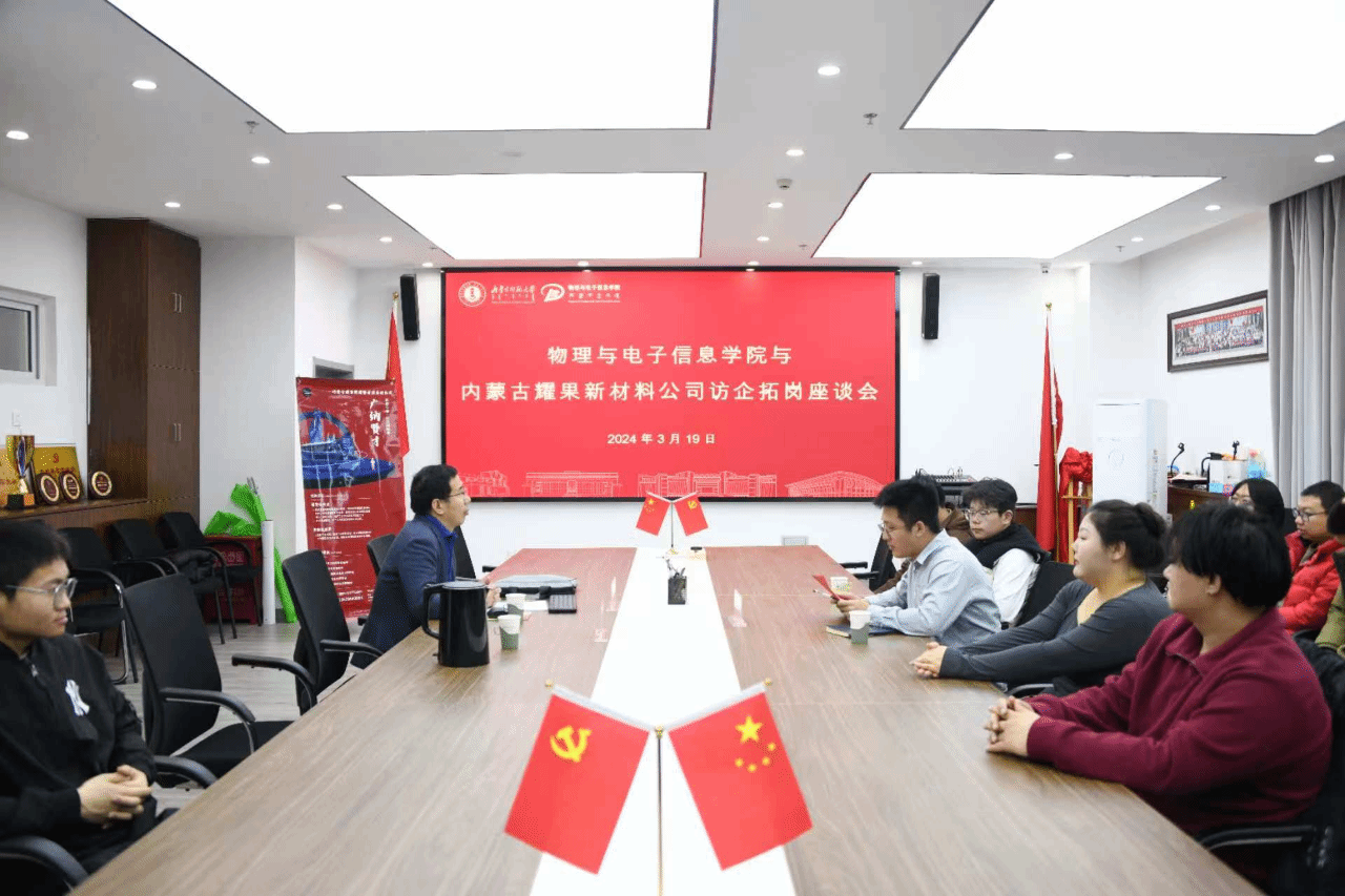 为深化校企协同育人机制,拓宽毕业生就业渠道,促进人才供需精准对接,3月19日上午,物理与电子信息学院与内蒙古耀果新材料有限责任公司在理工楼A座举行访企拓岗座谈会暨专场招聘宣讲活动。学院党委副书记欧志强、辅导员冀锦涛与内蒙古耀果新材料科技有限责任公司高耀昌一行人进行洽谈交流,2025届材料物理专业毕业生参加活动。