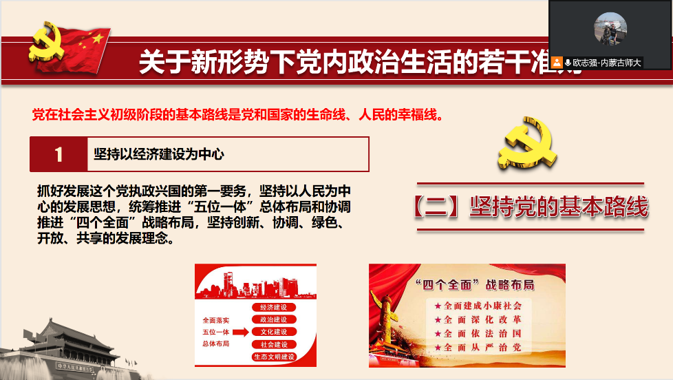 首先,支部书记组织学习了习近平总书记关于严肃党内政治生活的重要论述,并以《关于新形势下党内政治生活的若干准则》为题目讲了党课。对党内政治生活存在的突出问题、新形势下加强和规范党内政治生活的要求,以及对坚定理想信念、坚持党的基本路线等十二个方面进行学习研讨,强调办好中国的事情,关键在党要管党、从严治党。党要管党必须从党内政治生活管起,从严治党必须从党内政治生活严起。历史经验表明,我们党作为马克思主义政党,必须旗帜鲜明讲政治,严肃认真开展党内政治生活。
