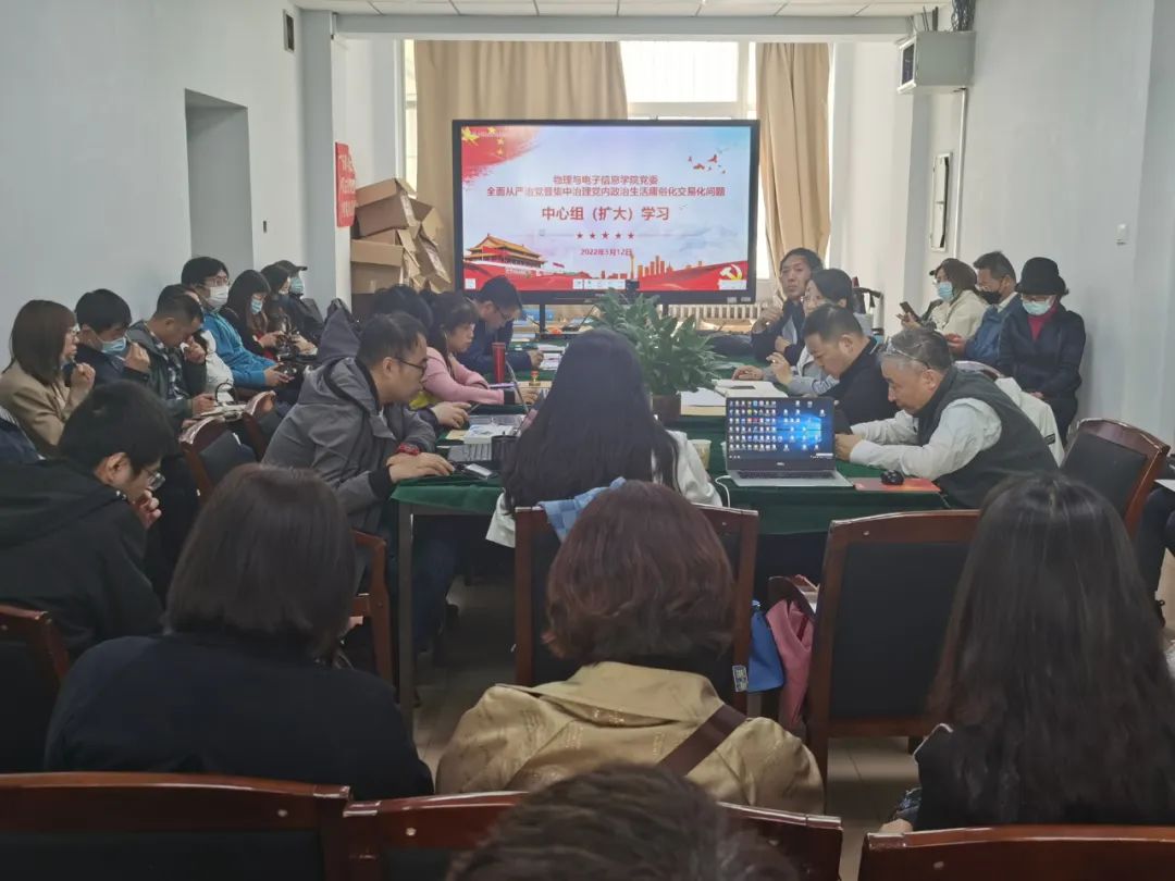 为进一步落实《内蒙古师范大学党委贯彻落实〈关于集中治理全区党内政治生活庸俗化交易化问题的工作安排〉的通知》,5月12日下午,物理与电子信息学院党委召开专题学习会,集中学习《内蒙古师范大学集中治理党内政治生活庸俗化交易化问题》承诺书内容。会议由党委书记刘美玲主持。