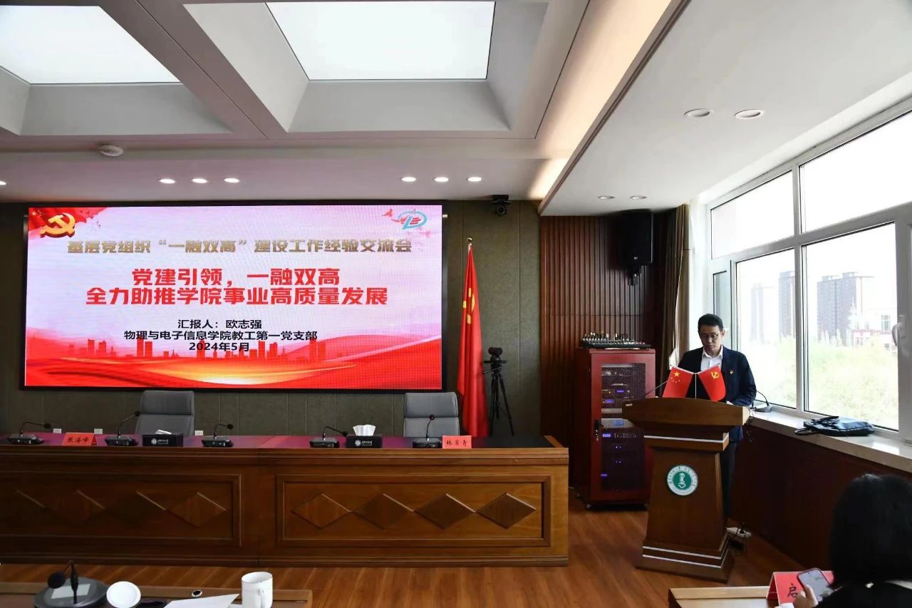 会上,物理与电子信息学院党委副书记、副院长、教工第一党支部书记欧志强以“党建引领 “一融双高 ”—— 全力助推学院事业高质量发展”为题做了汇报。汇报内容围绕“教工第一党支部基本情况”“政治引领,厚植凝心铸魂底色”“先锋引领,践行新时代科学家精神”“服务引领,内涵式培育优秀时代新人”四个方面,交流了我院教工第一党支部工作经验和做法。