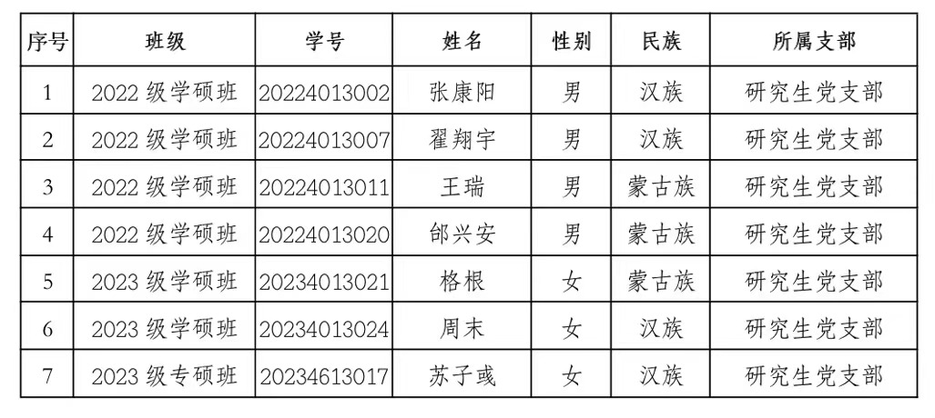 根据发展党员工作有关规定,经物理与电子信息学院研究生党支部召开支部委员会审查,张康阳等7名同志预审合格,拟于近期召开支部大会讨论接收张康阳等7名同志为中共预备党员。