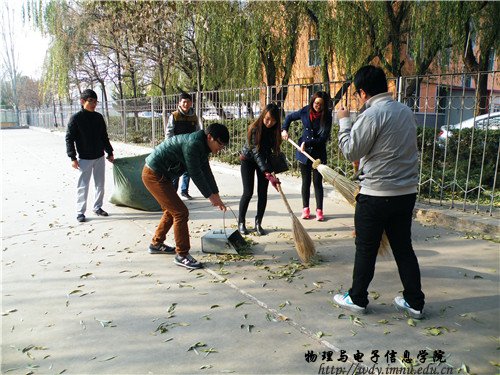本网讯 2014年11月15日午后,我院学生党支部组织第十期入党积极分子进行社会实践活动——清扫校园。活动中,入党积极分子们分成若干小组,成员们积极主动、各司其职,尽管天气严冷,但他们仍在坚守自己的工作,体验作为一名基层工作者的辛苦。通过此次活动,我院入党积极分子不仅体会到劳动光荣的真谛,更体现出我党为人民服务的优良传统;同时,也体现出他们正在用实际行动向党组织靠拢,有力的促进了我院党建工作的开展。