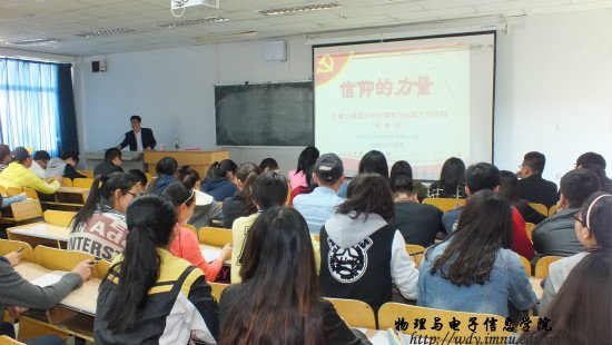 本网快讯 2015年4月19日下午,我院于计算机楼六共第二次开展第十一期积极分子分党校党课培训,主讲人辛国俊老师,我院萨其尔老师主持本次活动。本次党课以信仰的力量为主题,各位同学通过学习获益匪浅,深度思考与总结“信仰”所带来的力量,在提升自我的同时坚定了入党的决心。