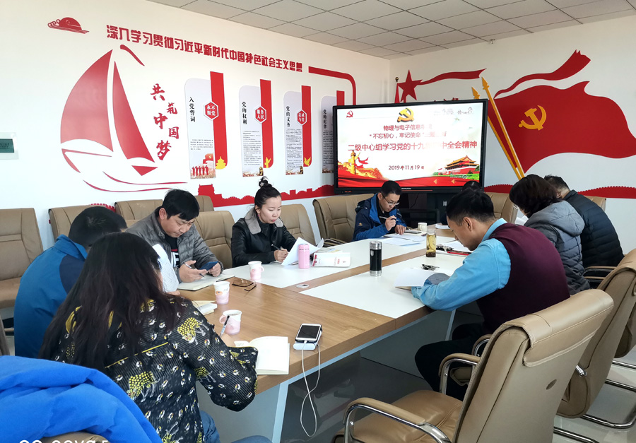 内蒙古师范大学物理与电子信息学院迅速响应,及时全面认真传达学习贯彻党的十九届四中全会精神。11月19日下午,党总支书记刘美玲主持召开学院二级中心组学习研讨会,传达学习贯彻党的十九届四中全会精神,并结合正在开展的“不忘初心、牢记使命”主题教育,对全院学习贯彻工作进行安排部署。会上,学院党总支委员、支部书记分章节领学《中共中央关于坚持和完善中国特色社会主义制度、推进国家治理体系和治理能力现代化若干重大问题的决定》内容。