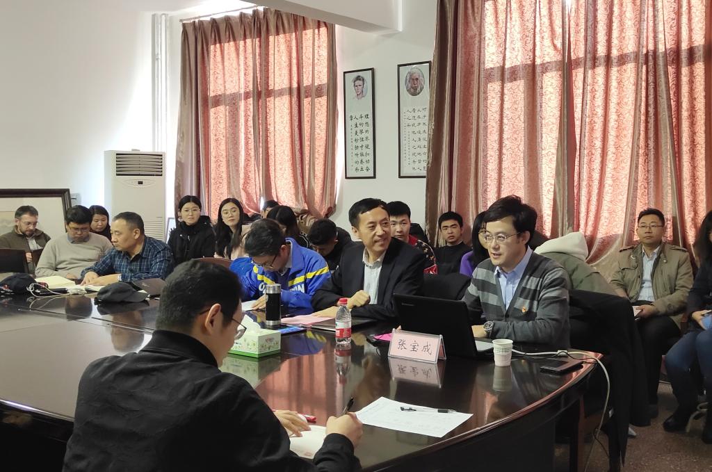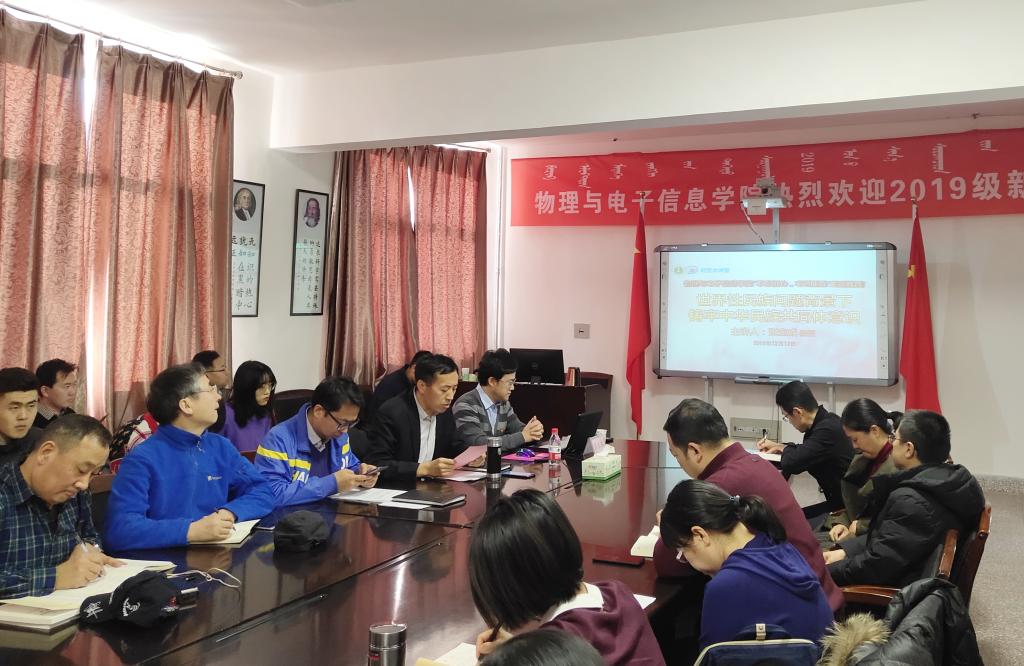 12月12日下午,我院在物理楼304会议室召开“不忘初心,牢记使命”主题教育专题学习会,我校党委委员、宣传部部长张宝成教授出席会议为全体党员讲党课,主题为“世界性民族问题背景下铸牢中华民族共同体意识”。会议由曹永军副院长主持,我院党总支书记刘美玲,党总支副书记兼副院长张伟,副院长那日苏、全体教职工以及研究生党员聆听了讲座。