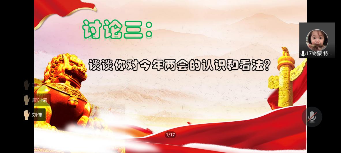 两次小组讨论会是本次培训活动中的一大亮点。同学们积极参与、踊跃发言,讨论会气氛热烈,打破了线下培训空间限制的僵局。大家互相交流,产生了思想碰撞,对两会和人类命运共同体有了更新地理解和认识。