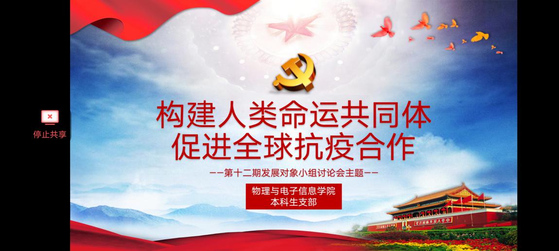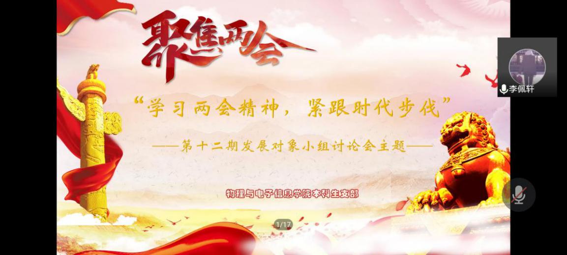5月27日至6月6日,物理与电子信息学院本科生支部在各支委的指导下为第十二期发展对象、共计47人进行了线上培训。此次培训内容分为六大板块,分别是“学习强国”App的党史、十九大时间、用典等栏目;中国大学MOOC" 学习课程《新时代中国特色社会主义理论与实践研究》;经典著作阅读(《共产党宣言》《习近平谈治国理政》《习近平用典》等著作);观看红色电影《薪火相传》;主题小组讨论会:“学习两会精神,紧跟时代步伐”和“构建人类命运共同体,促进全球抗疫合作”。