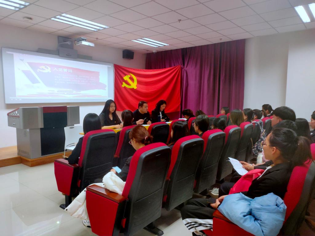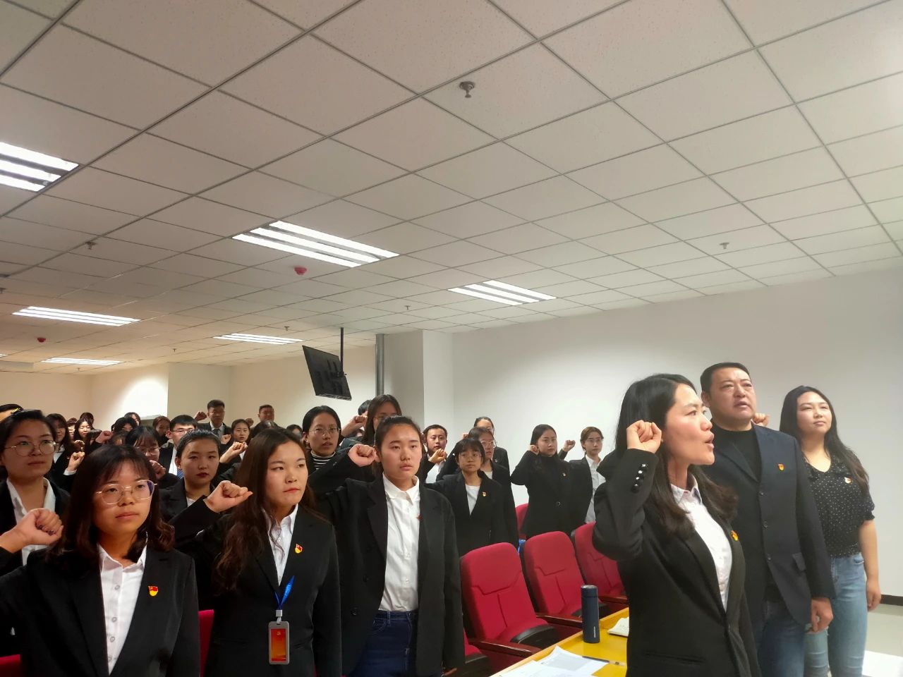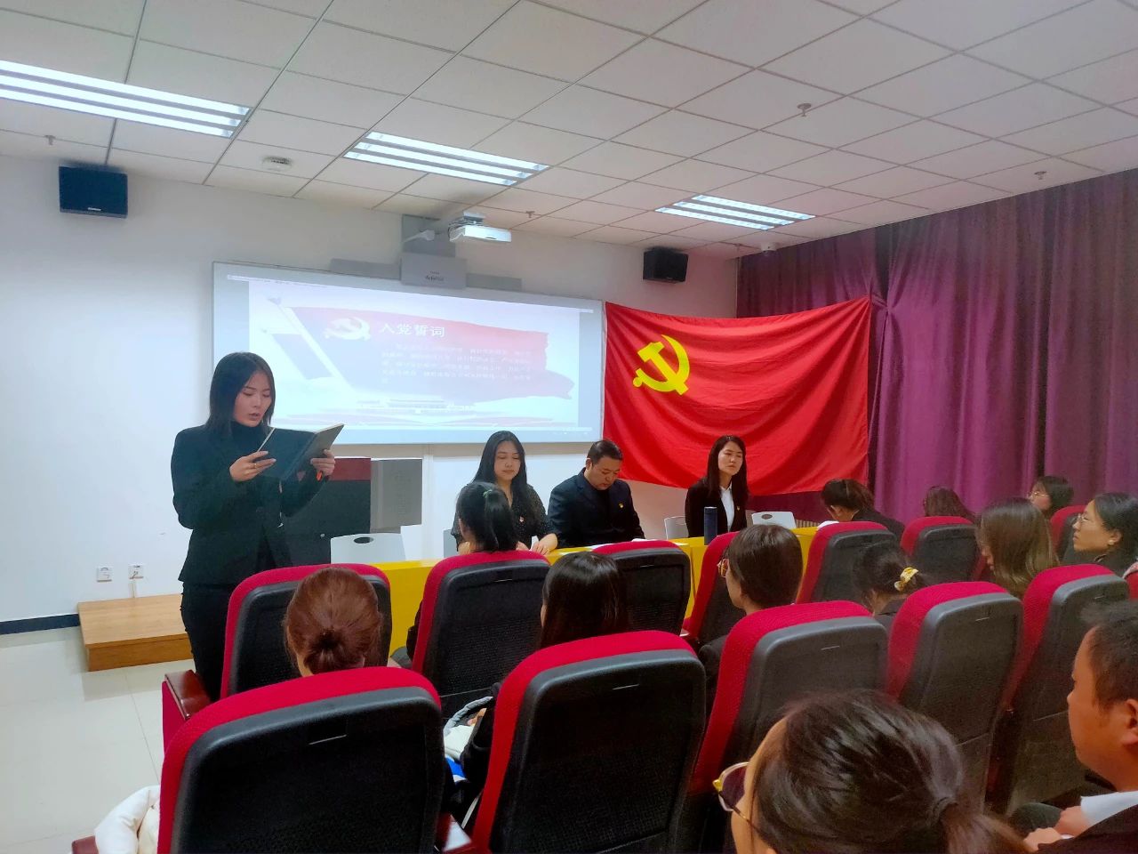 A303室悬挂着鲜红的党旗,衬托出庄重的气氛。大会伊始,全体起立奏唱《国际歌》,在雄壮的《国际歌》后,宝力尔老师带领63名同志庄严宣誓:“我志愿加入中国共产党,拥护党的纲领,遵守党的章程,履行党员义务,执行党的决定,严守党的纪律,保守党的秘密,对党忠诚,积极工作,为共产主义奋斗终身,随时准备为党和人民牺牲一切,永不叛党!” 每位党员都表达了对党忠诚的决心。面对党旗,大家接受了一次身心的洗礼。仪式上,预备党员代表海兰同志作了表态发言,表达了对党的深厚感情和为党的事业奋斗终身的决心。