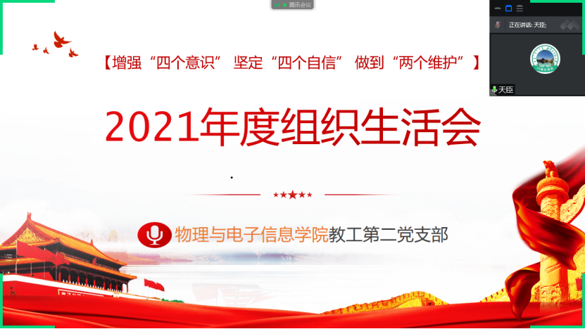 按照内蒙古师范大学党委《关于召开2021年度组织生活会和开展民主评议党员的预通知》要求,根据《中国共产党组织工作条例》《中国共产党支部工作条例(试行)》《中国共产党党员教育管理工作条例》等,物理与电子信息学院教工第二党支部于3月10日召开支部组织生活会,教工第二党支部全体党员参会,学院党委书记刘美玲列席会议。