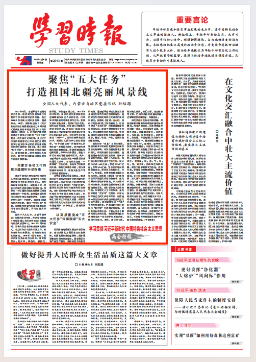 《学习时报》2024年3月6日第1版刊发全国人大代表、内蒙古自治区党委书记孙绍骋文章《聚焦“五大任务”打造祖国北疆亮丽风景线》。