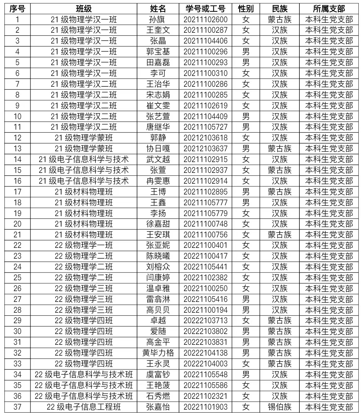 根据发展党员工作有关规定,经物理与电子信息学院本科生支部召开支部委员会审查,孙旗等37名同志预审合格,拟于近期召开支部大会讨论接收孙旗等37名同志为中共预备党员。