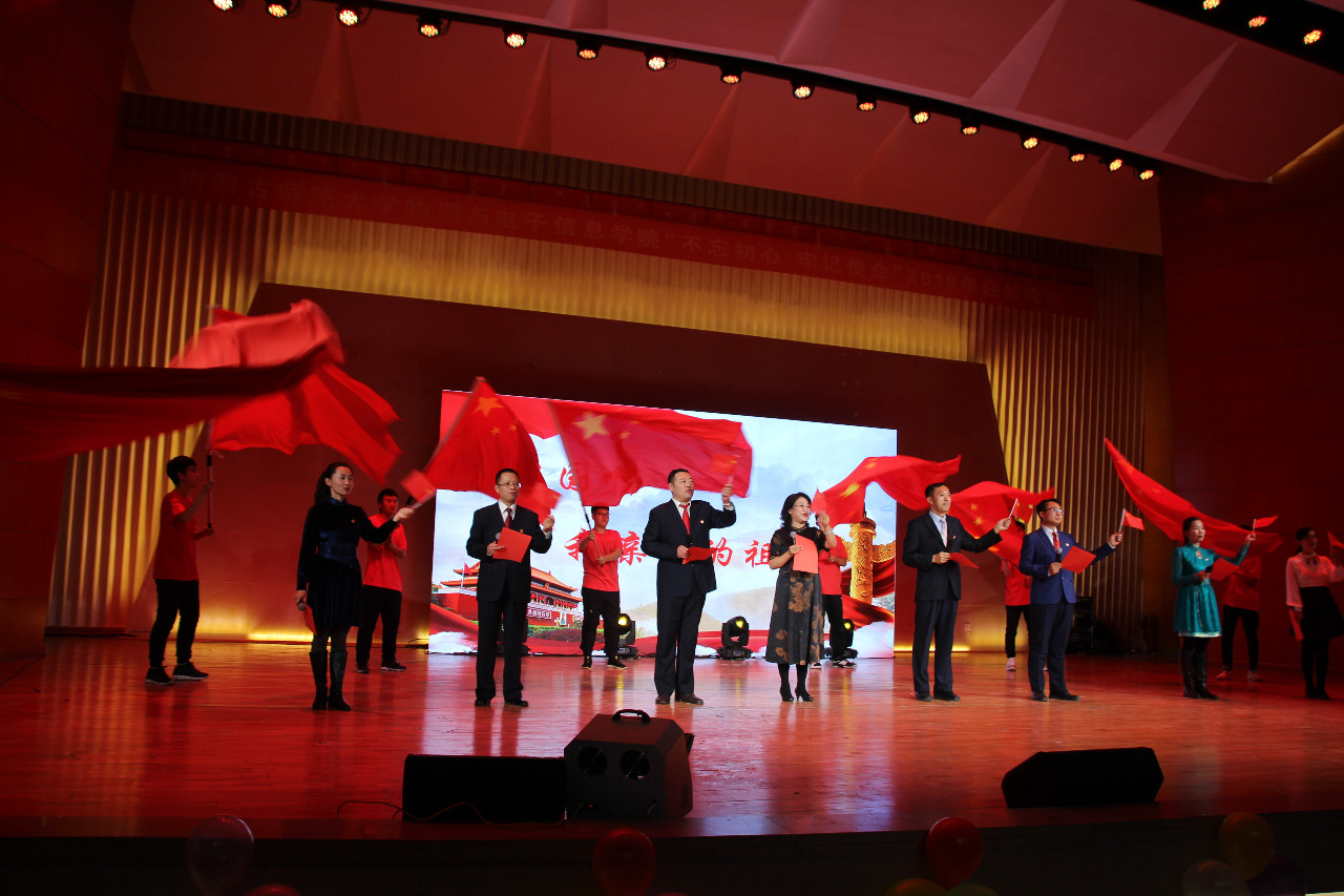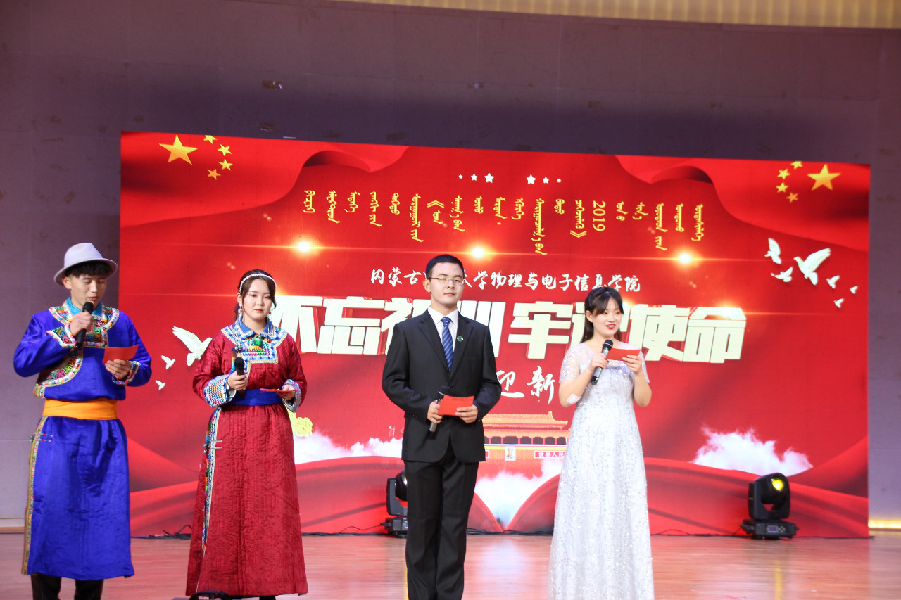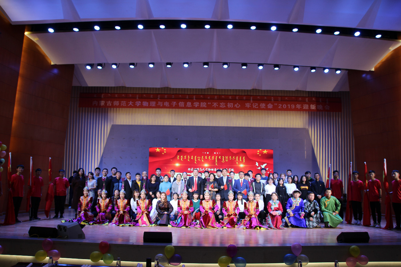 为庆祝新中国成立70周年,深入贯彻落实“不忘初心,牢记使命”主题教育精神,激发广大青年学子爱国之情、强国之志,11月22日晚7点,物理与电子信息学院在盛乐音乐厅举办了“不忘初心、牢记使命”主题教育暨2019年迎新晚会。学院党总支书记刘美玲,副院长曹永军,党总支副书记兼副院长张伟,副院长那日苏,学院各系、中心负责人,各班班主任及辅导员与500多名新老学生,欢聚一堂。
