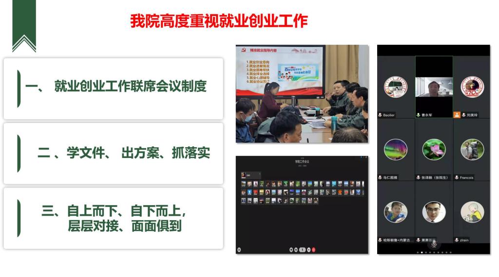 学院全体教师都积极参与到毕业生就业工作中,任课教师、毕业论文指导教师在学生毕业和就业工作中的指导作用进一步凸显。辅导员、班主任密切配合,细化工作安排,以年级、专业、班级为单位精心组织就业活动,开展全员、全方位、全过程就业指导。在每周的“就业汇报会”上,包联辅导员分别围绕“毕业生就业意向”“联系毕业生情况”“考研复试(调剂)情况”“发现的问题和难点”等内容进行工作汇报,分析存在问题,探讨解决办法。我院4位辅导员老师讲授《大学生职业生涯规划与就业指导》课,将就业理论和实践进一步结合。