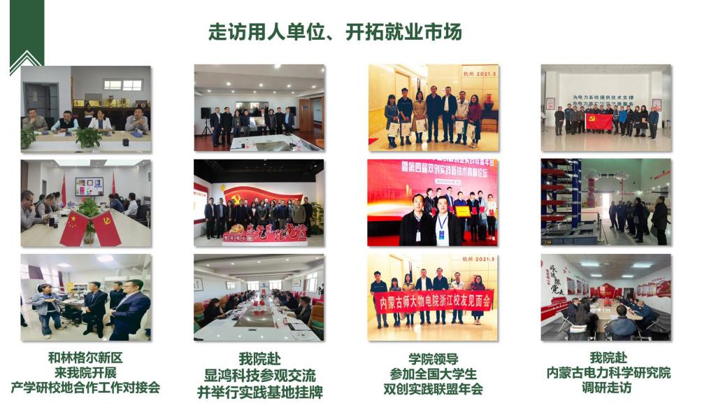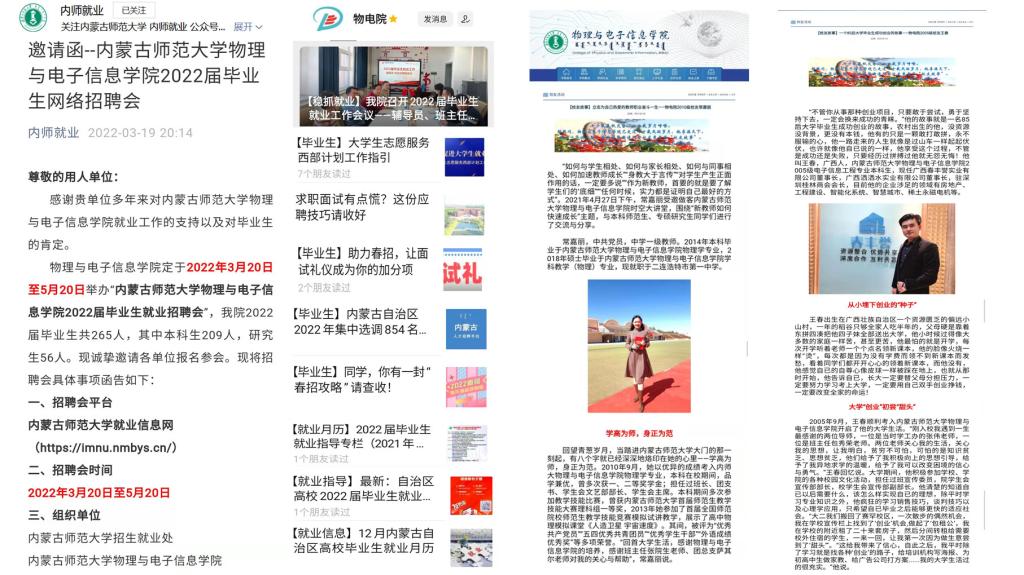学院充分挖掘物理系、电子系、材料系教师就业资源和校友资源,将就业推荐与专业实习、毕业设计有机结合,扩展社会企业对接渠道,积极开拓市场性岗位。学院教师积极联系了显泓科技、万德、起立科技、科电数据、上海霆华能源、内蒙古欧晶科技股份有限公司等用人单位,从3月份开始陆续为学生提供线上面试机会。历届毕业生校友也积极推送所在单位的招聘信息。为了搭建毕业生求职和用人单位招聘的对接通道,我院于2022年3月20日至5月20日举办“内蒙古师范大学物理与电子信息学院2022届毕业生专场网络招聘会”,努力实现云中招聘不断线,云中服务不断档,就业指导不停歇。
