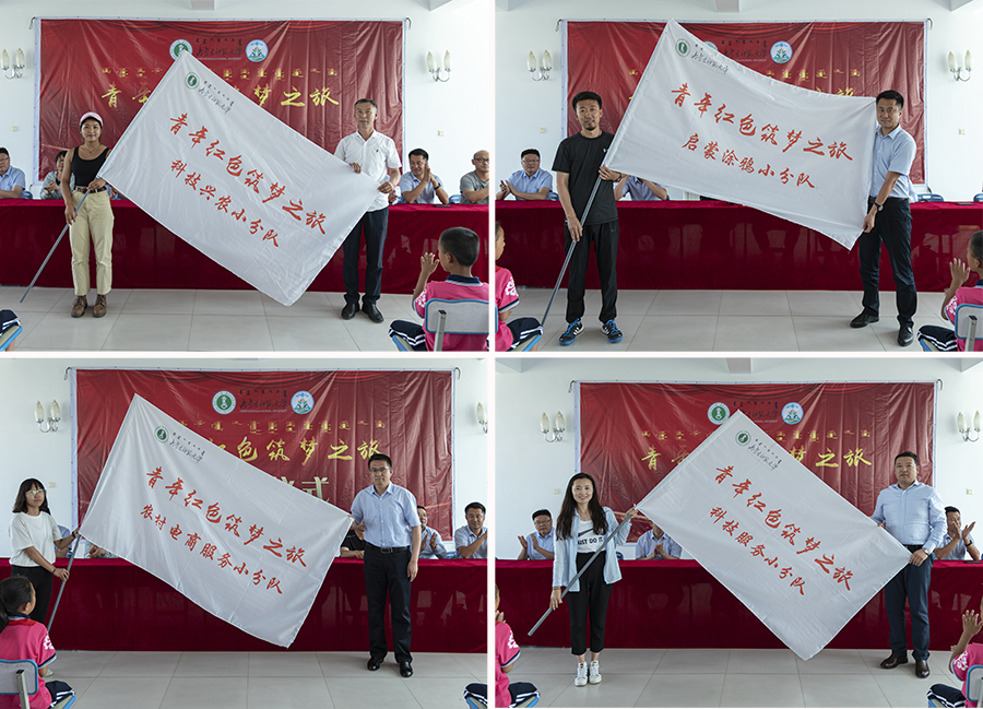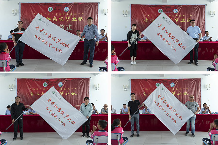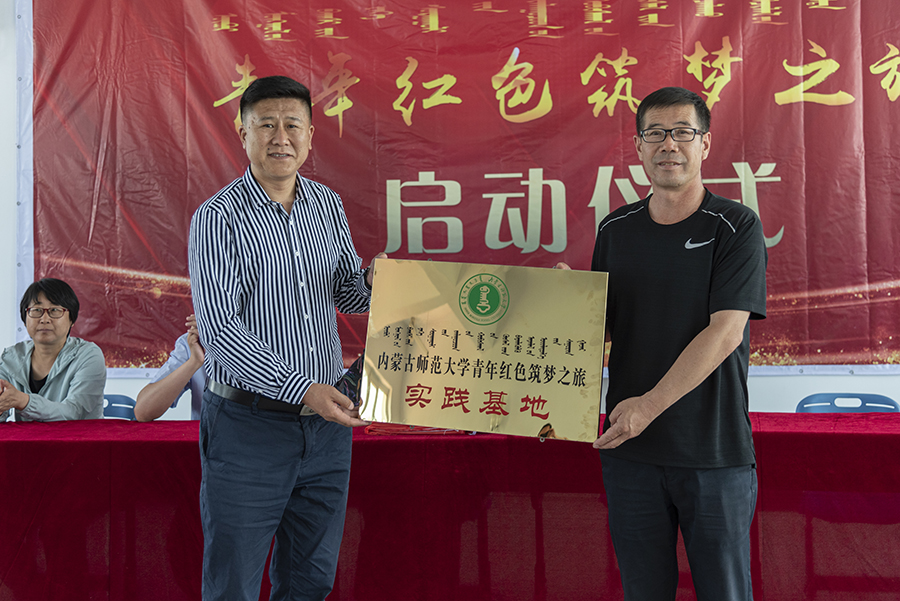 启动仪式上,音乐学院党总支书记石连柱向乌兰夫学校校长云吉光颁授“内蒙古师范大学青年红色筑梦之旅实践基地”牌匾,许琳处长为“青年红色筑梦之旅”实践活动总队授旗,历史文化学院、旅游学院、地理科学学院、物理与电子信息学院、计算机科学技术学院、音乐学院、美术学院、工艺美术学院相关领导领导分别为“青年红色筑梦之旅”学院小分队授旗。