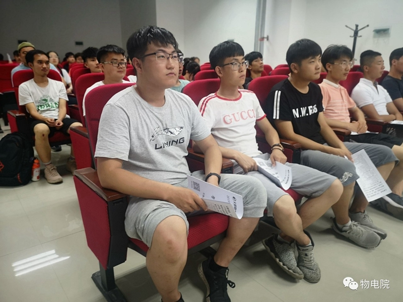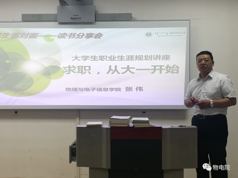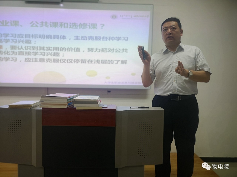 本网讯: 为进一步推进大学生创新创业教育,贯彻“三全”育人,积极推进大学生职业发展指导,有针对性地对低年级学生进行分层分类生涯教育,引导广大学生科学合理规划大学学习与生活,6月11日晚7点半,大学生职业生涯规划专题讲座在理工楼A203教室举行,物理与电子信息学院党总支副书记张伟以读书分享的形式,为18级电子信息科学与技术班和电子信息工程班的同学进行了题为《求职,从大一开始》专题讲座,班主任段国俊、辅导员宋鑫伟老师到场与学生共同聆听了讲座。