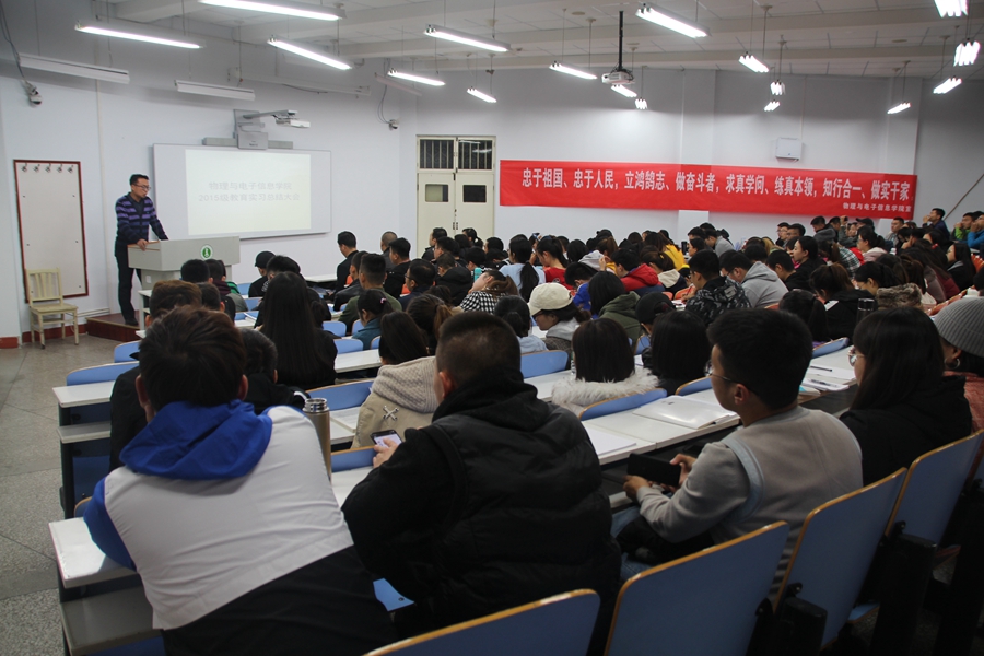 本网讯 2018年11月14日,我院在赛罕校区田楼九共举办了2015级学生“我的肩膀—能挑多重的担子?”主题教育实习总结大会。学院党总支副书记兼副院长张伟、副院长那日苏、实践创新部万欣欣、15级物理学蒙班班主任哈木图、物理学汉班班主任田晓、16级物理学蒙班班主任哈斯朝鲁、物理学汉班班主任孙咏萍、学工办木其尔与15、16级物理系学生参加总结大会,大会由那日苏教授主持。 会上,首先由那日苏教授对学院本次实习工作总结道:本次实习由教务处统一安排,赴巴彦淖尔、赤峰、兴安盟等初中进行实习。每个人都能得到踏上讲台的机会,在学习理论知识的同时通过实践增长学生的教学经验,有利于教学技能的提高与发展。随后由15级物理学蒙班、汉班的六名同学进行现场模拟教学。经过一个月的实习历练,同学们能够用设计精巧的PPT、完整流畅的口语表达将看似“无趣”的物理知识教授给学生,赢得了台下领导老师与同学的阵阵掌声。 本次教育实习总结大会旨在深入贯彻落实全国教育大会和新时代全国高等学校本科教育工作会议精神,提升我院本科师范生教育教学工作。一个多月的实习生活,让同学们在实践过程中得到了成长与锻炼,巩固了基础物理教学的基本技能,更收获了浓浓的师生情谊,深刻体会到了为人师表、教书育人的价值和意义。 图文编辑:新闻专题部 校正稿件:姚锦明 责任审核:萨其尔