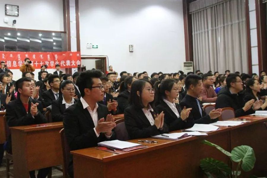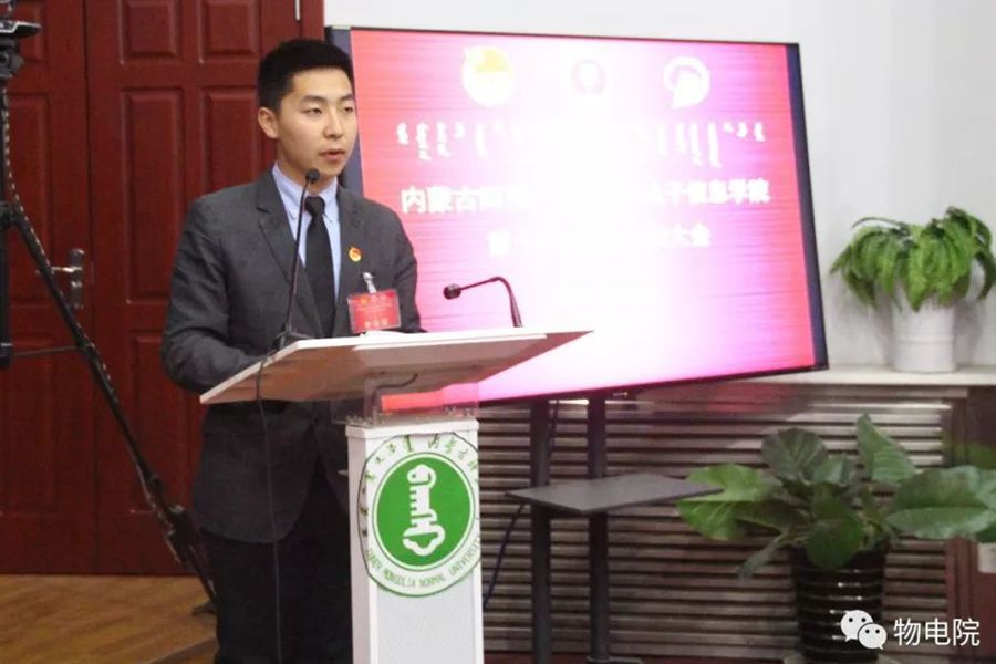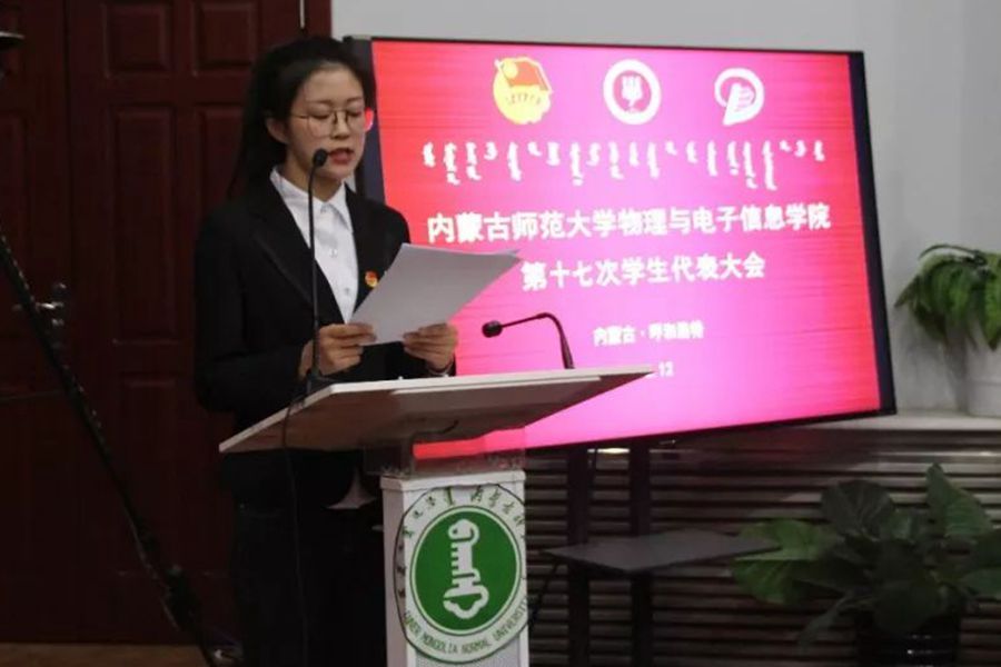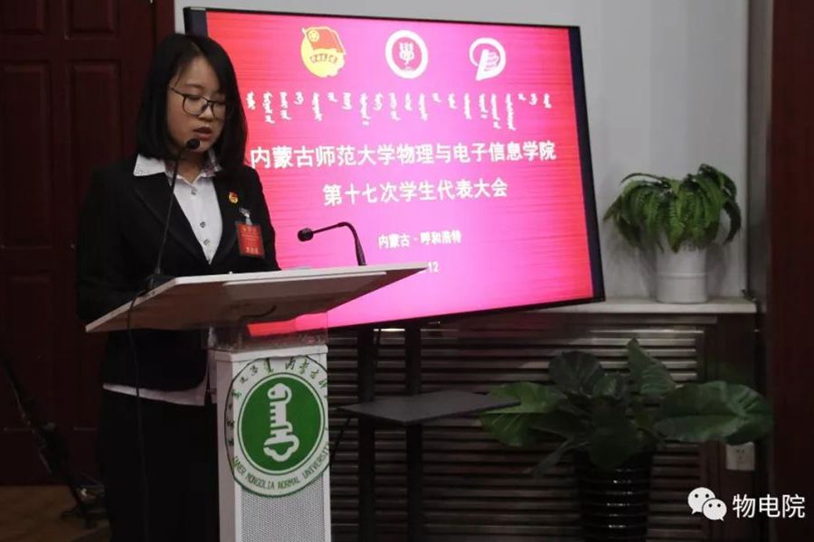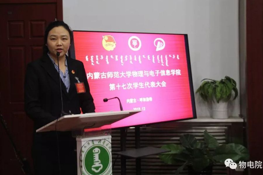 本网讯 12月2日上午9时整,内蒙古师范大学物理与电子信息学院第十七次学生代表大会于信息楼报告厅隆重开幕。大会开幕式由辅导员王乐主持,学校团委书记贾世琦、学院党总支书记刘美玲、副院长曹永军、党总支副书记兼副院长张伟、副院长那日苏出席开幕式,包括我院学生代表以及兄弟学院邀请嘉宾在内110余人参会。