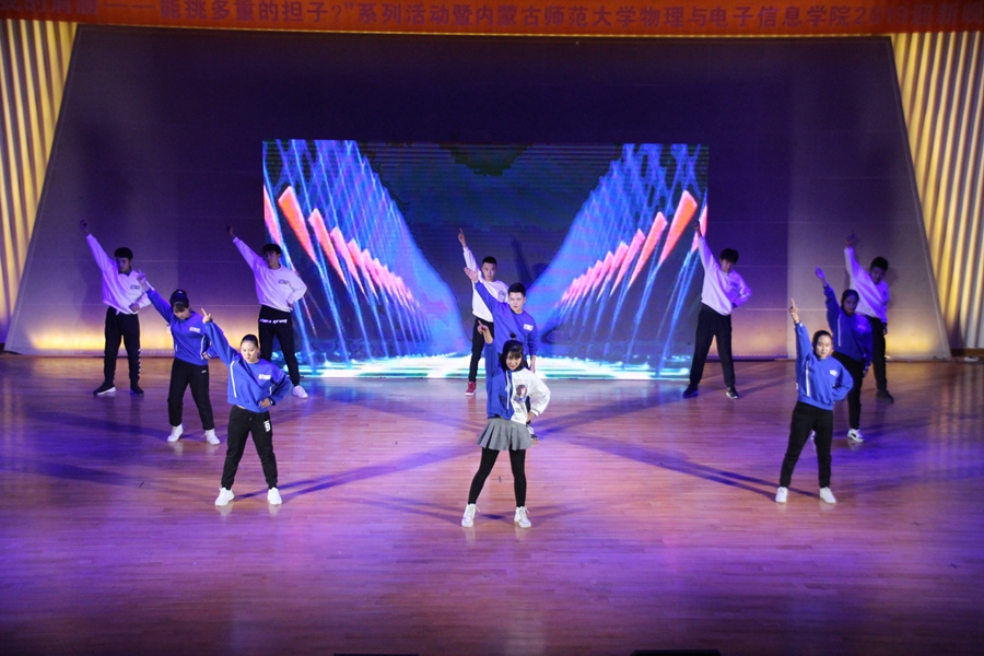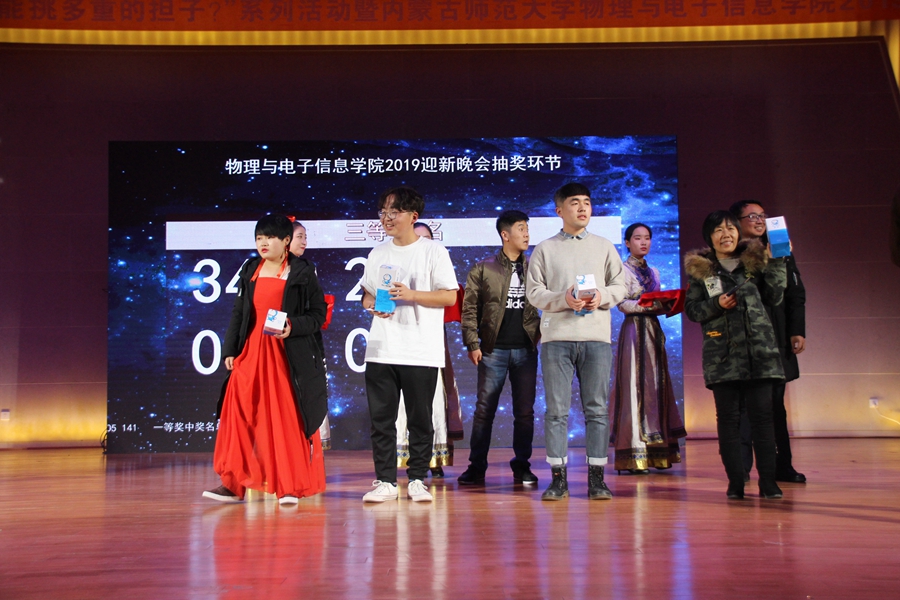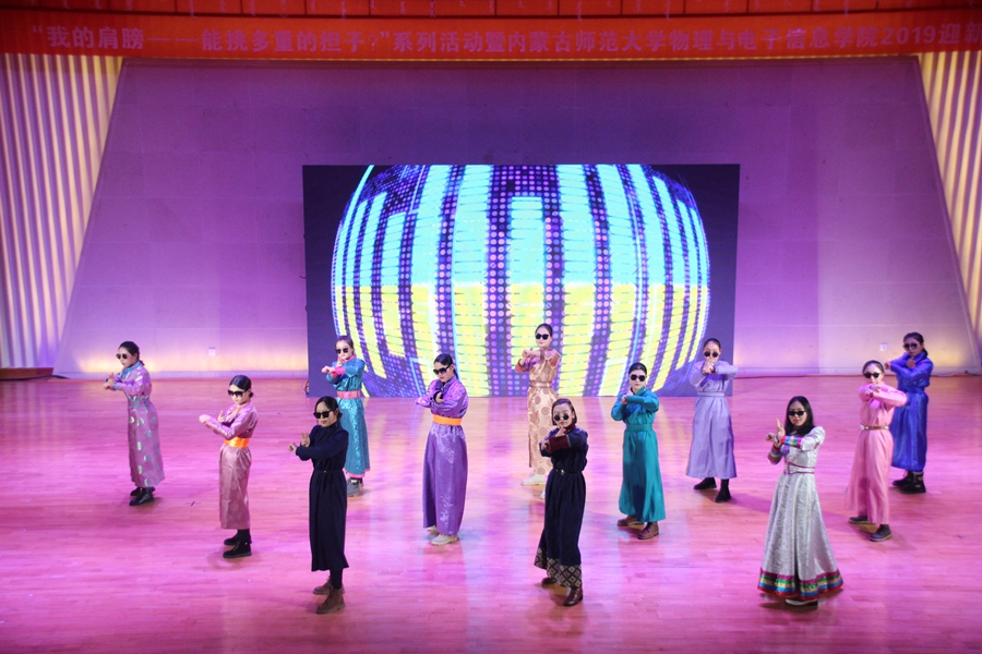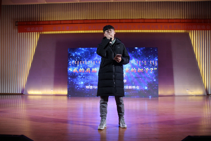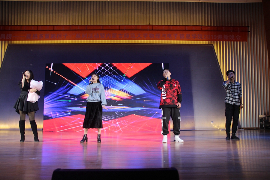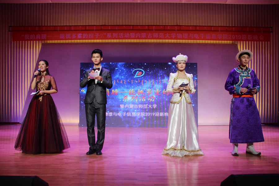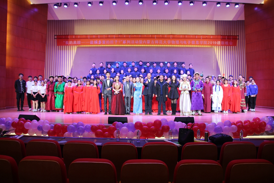 本网讯 为学习贯彻宣传十九大精神、喜迎内蒙古师范大学第十一次党代会,激发同学们的青春活力与集体主义精神,为大学生活画下绚丽难忘的一笔。2018年12月7日晚七点半,“我的肩膀——能挑多重的担子?”系列活动暨内蒙古师范大学物理与电子信学院2019迎新晚会于原民族艺术学院报告厅隆重举行。学生招生就业处处长许琳、团委副书记包双成、学生工作处副处长宝贵、各学院团总支、学生工作与就业办公室的老师们、学院党总支书记刘美玲、副院长曹永军、党总支副书记兼副院长张伟、副院长那日苏及学院教职工与学生500余人参与晚会。 灯光熄灭,观众们的目光被别出心裁的先导片所吸引。影片讲述了新生们从备战高考到来到内师大物电院报道的经历,勾起了同学们无数的回忆。我院领导老师以及18级各班班主任也出现在大屏幕上,对同学们表达了最真挚的欢迎以及殷切的期望。随后,一首洒脱奔放的《像风一样自由》正式拉开了晚会的序幕。四位端庄大气的主持人现身舞台中央。他们衣着华丽,意气风发,言语间透露出满满的自信与活力。古香古色的《玉人歌》展现了玉人们柔美的身段和悠扬的歌声,由辅导员王乐和五位同学们的组合完美演绎了新颖别致的歌曲串烧《声之形》;18工程班青春靓丽的少年少女们深情献唱《热勇》,用青春活力点燃花样年华;神秘的墨镜下,身穿蒙古袍的蒙古族女孩们以舞蹈《拥抱明天的太阳》尽情挥洒梦想。优雅别致的乐器弹唱《浮生未歇》带我们回到了樱花纷飞的季节,辅导员宋鑫伟和18级电子信息工程班程雪琪同学的朗诵《党旗颂》深情歌颂了拥有五千年历史的华夏之光。激动人心的抽奖环节来临,摇动的数字锁定了7位幸运观众,而我们也有幸能欣赏获得一等奖的幸运观众献唱《年少有为》。晚会继续,优美动听的独唱《乌兰巴托之夜》使我们仿佛置身于乌兰巴托静谧美好的夜晚;动漫社的coser们友情出演的舞蹈《极乐净土》将全场的气氛推向沸腾的高潮;相声《铃铛谱》以幽默诙谐的语言惹得观众们捧腹大笑;18物理学蒙班的同学们身着华丽精致的蒙古族服装款款走来,向大家展示民族服装独特的魅力与风情;活力四射的舞蹈《dancing our soul》让大家领略了斗舞的精彩激烈;由17级物理学蒙班全体同学以及班主任木其尔献上磅礴的合唱《永远的蒙古》,描绘出一望无垠的碧波草原。最后,领导老师们走上舞台,与演员们亲切合影,为晚会画下了完美的句号。 这是桃李芬芳、欢声笑语的一夜,有舞姿曼妙,有歌声飞扬。有爱的地方就有梦想,有梦想的地方就有希望,希望同学们能立报国之志,艰苦奋斗,全面发展,树立终身学习的理念,为实现中华民族伟大复兴的中国梦而奋斗终身!注:校党委宣传部新闻媒体创意中心马研同学对本文亦有贡献 图文编辑:刘静怡 矫正稿件:姚锦明 责任审核:宋鑫伟