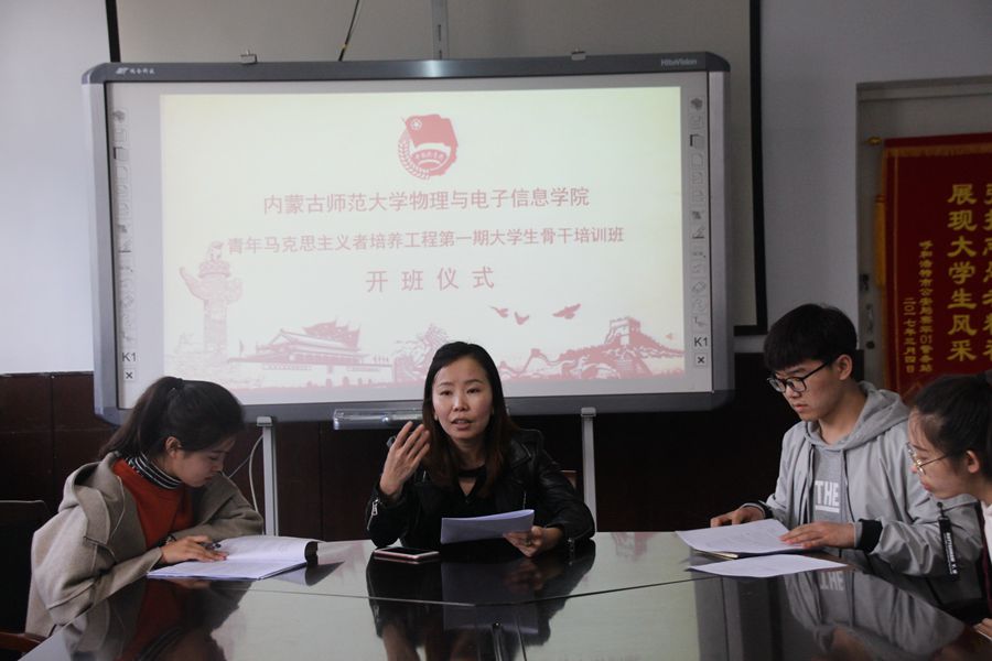 为加强我院大学生骨干、共青团干部及青年知识分子的思想道德修养,物理与电子信息学院于2018年3月23日在物理楼会议室举行青年马克思主义培养工程第一期大学生骨干培训班开班仪式。我院团总支书记萨其尔老师主持会议。