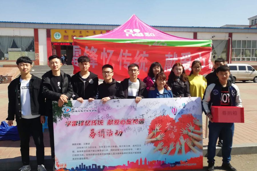 2018年3月23日,物理与电子信息学院组织开展了“学雷锋忆传统,献爱心促和谐”公益募捐活动。 路过的同学们纷纷献上自己的一份爱心,并希望通过参加这样的公益活动,为关爱青少年健康成长贡献一份力量。本次活动所收到的善款,将全部用于资助贫困学童的学习与生活。扶危助困,乐善好施是中华民族的传统美德,此次活动也让同学们感受到了帮助别人的快乐与自己身为青年的社会责任感。