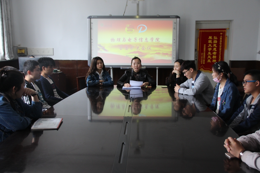 2018年4月12日,我院于物理楼会议室召开物理与电子信息学院全委扩大会议,学院团总支书记萨其尔老师主持召开会议,学工办木其尔老师,各班团支部书记及团员代表参加会议。