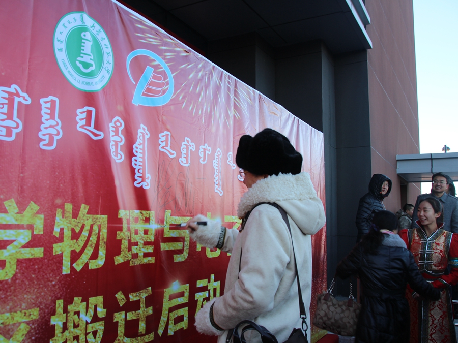 仪式开始,首先由教师代表赵凤歧教授发言,赵老师对前来参加仪式的师生们表示欢迎,并代表全体教师表达了对物电院的美好祝福。随后学生代表李嘉欣同学发言,她代表我院学子期待学院能够在盛乐校区取得新的辉煌成绩。同时,院长特古斯教授在感言中说到:物理与电子信息学院作为一个历史悠久的学院,在赛罕校区取得了许多优异的成绩。来到盛乐校区又是一个新的起点,理工楼硬件设施正在逐步完善,并且拥有优美的学习环境,我们会努力克服种种困难,争取在盛乐校区取得更卓越的成就,使物电院的明天更加灿烂辉煌。全体师生深受鼓舞,报以热烈的掌声,此时礼炮带着美好期待轰鸣着冲向天空,参加仪式的全体师生于理工楼门前合影,以纪念这激动人心的时刻。搬迁仪式的最后,全体老师于幕布上签名留念,并集体参观理工楼,教师们纷纷对这未来工作学习的场所良好的基础设施条件赞不绝口。