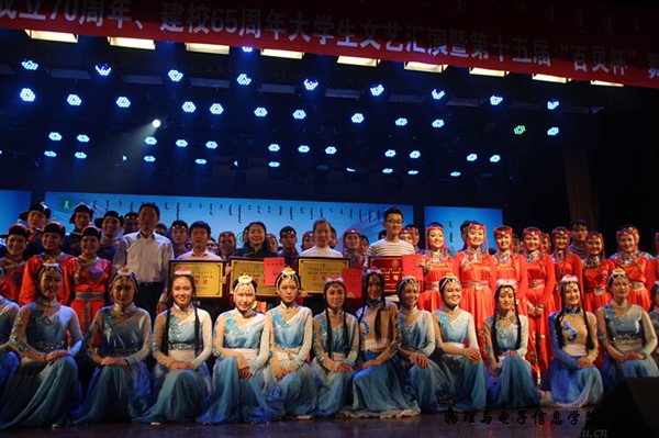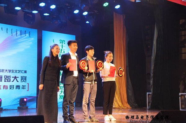 伴随着所有节目的全部结束,主持人宣布获奖单位和个人名单,我院团总支书记萨其尔老师作为学院代表上台接过第十五届“百灵杯”舞蹈大赛二等奖奖牌与最具人气奖,并且萨老师与塔林托亚老师还获得优秀指导老师奖项。在晚会结束后,我院党总支副书记何小龙老师与舞蹈演员们以及工作人员们亲切握手并合影留念表示祝贺。至此,第十五届“百灵杯”文艺汇演已全部结束。本次比赛荣获佳绩也显示出物理与电子信息学院对大学生文化艺术活动的支持力度,舞蹈演员们也始终秉承着为学院争光的态度,努力训练,不怕累不怕苦,他们的完美表现再一次向全校展示“物电”精神!