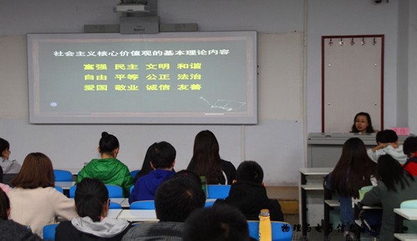 本网讯 2017年3月23日下午,我院于田楼第九公共教室进行了第二次入党积极分子分党校培训课程。本次党课以“社会主义核心价值观与四信四进”为主题,特邀法政学院党总支副书记牛佳老师担任主讲人并由我院团总支书记萨其尔老师主持本次活动。