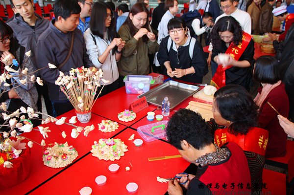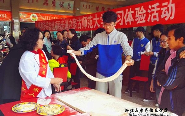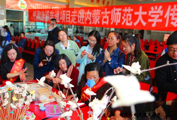 本网讯 2017年3月31日上午,全城非物质文化遗产体验第二站落脚内师大,在师大食堂二楼展开了以“寒食节里看非遗,传统技艺代代传”为主题的现场传习活动。本次活动由呼和浩特市非物质文化遗产保护中心、内蒙古师范大学文化产业发展研究中心和内蒙古科学技术普及学会主办,内蒙古师范大学赛罕后勤集团饮食服务中心、物理与电子信息学院和国际交流学院承办。