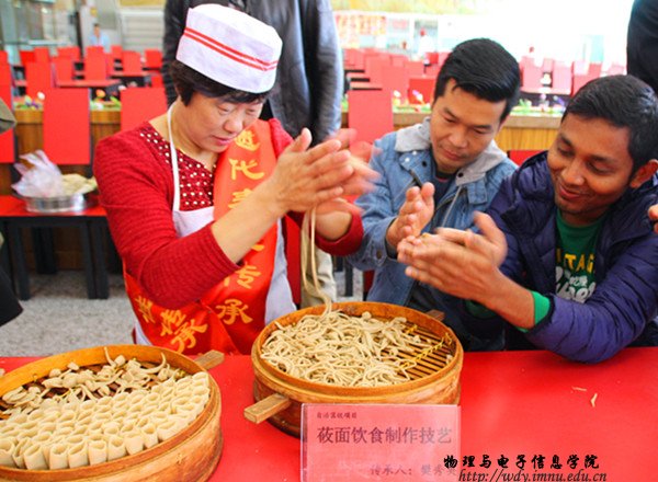 活动项目分为和林格尔面塑、归绥传统面点制作技艺、莜面饮食制作技艺和青城德兴源烧麦四项。活动吸引了我校的很多外国留学生前来交流与学习,他们不仅亲自动手学习制作烧麦的皮、搓莜面条、拉面、做面塑,还与传承人赞叹中国食物的丰富与美味。我院同学也亲自尝试了拉面的制作过程,体会到中国传统食物制作的精妙之处,并表示今后会多学习一些传统食物的制作方法,将这种伟大的文化传承下来。