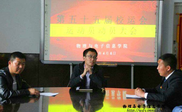 本网讯 2017年4月6日下午,我院在物电楼会议室召开第五十五届校运会运动员动员大会,我院党总支副书记何小龙老师、学工办苏雅拉老师、教练员玉林同学、学生会体育部成员以及我院运动员们参加本次会议,并由苏雅拉老师主持会议。