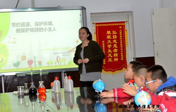 本网讯(文/图 边辑)在第48个世界地球日来临之际,为提高学校师生的环境意识,特别是能够让青少年儿童了解世界地球日的有关知识,并懂得保护地球的重要性,让保护环境成为幼儿的一种自觉行动,由呼和浩特科学技术协会、内蒙古科学技术普及学会主办,内蒙古师范大学物理与电子信息学院承办的大手拉小手“地球日”科普活动在师大举行。