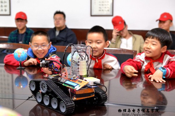 活动最后,孩子们还现场观摩了内蒙古师范大学大学生直通挑战杯的获奖作品——灭火机器人的灭火演示,进一步激发了孩子们对科技发明的兴趣。