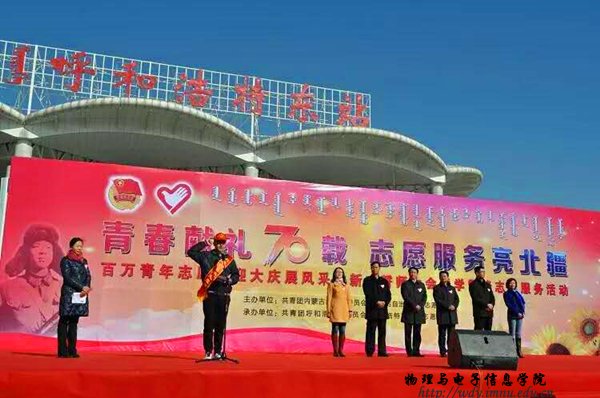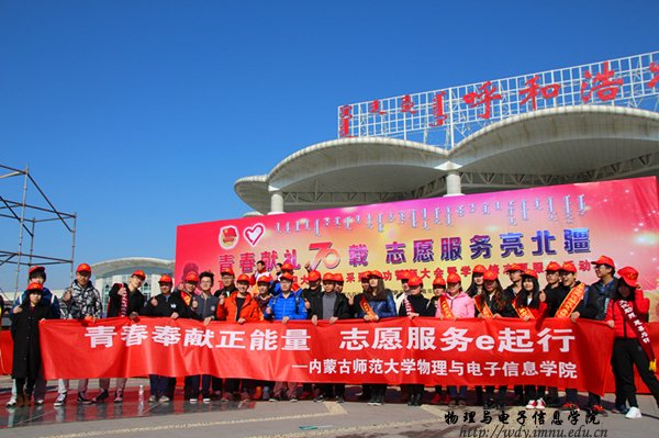本网讯 2017年3月3日由自治区团委、内蒙古青年志愿者协会主办,呼和浩特市团委、呼和浩特市青年志愿者协会承办的“青春献礼70载 志愿服务亮北疆 百万青年志愿者迎大庆展风采建新功暨学雷锋志愿服务”主题宣传活动在呼和浩特市火车东站启动。我院志愿者代表队作为文化助残志愿者队参加这次活动。