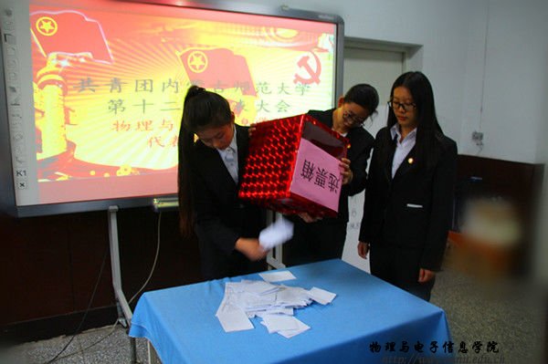 伴随团歌激昂的旋律,会议正式开始。首先由我院学生会主席冯楷森宣读批复,团总支助理蔡雅芳宣读《共青团内蒙古师范大学第十二次代表大会代表选举法》,随后根据会议议程,与会人员对《选举法》进行表决。表决完毕后,由宣票人刘慧翎,监票人李嘉欣,计票人王静同学共同监督并组织进行投票表决。最终,经过差额选举的方式成功选举出萨其尔老师、苏雅拉老师、娜荷雅同学、连娇同学、崔丹丹同学、李昕彤同学、荀雪昕同学等七位同志为共青团内蒙古师范大学第十二次代表大会代表。