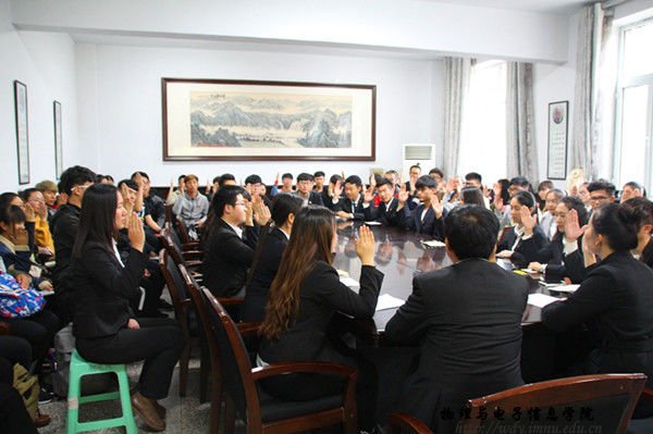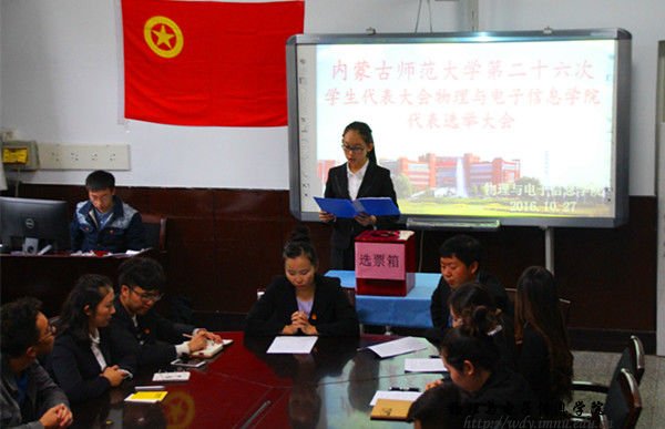 本网快讯 根据《中国共产主义青年团章程》《中国共产主义青年团基层组织选举规则》和《中华全国学生联合会章程》 《中华全国学生联合会关于加强和改进高校学生会研究生会建设的指导意见》有关规定。2016年10月27日中午,我院于物电楼会议室举行内蒙古师范大学第二十六次学生代表大会物理与电子信息学院代表选举大会。我院团总支书记萨其尔老师,学工办苏雅拉老师及学院学生代表出席此次大会,并由张俪馨同学主持会议。