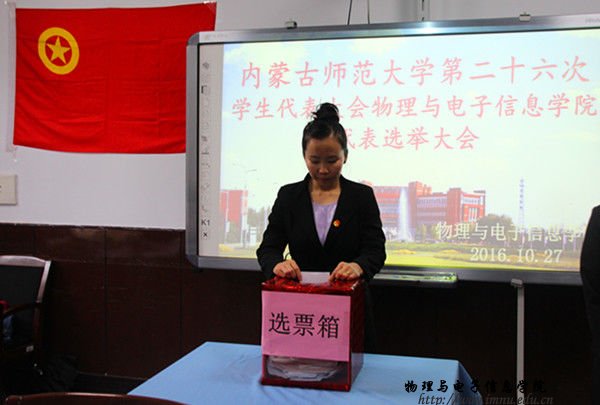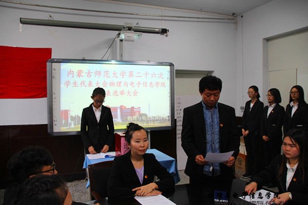 在会上,首先由学院学工办苏雅拉老师宣读了内蒙古师范大学学生委员会关于同意物理与电子信息学院参加学校学生代表大会选举工作的批复。随后学生会副主席娜荷雅宣读了《内蒙古师范大学第二十六次学生代表大会代表选举办法》,现场对《选举法》进行举手表决并且获得全票通过。最后由宣票人刘慧翎,监票人丁研,计票人王静同学根据会议规定,通过差额选举的方式选举产生冯楷森、翁秀章等九位同学为内蒙古师范大学第二十六次学生代表大会的代表。