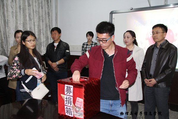 本网讯 我院青年教师陈玉和,于2015年12月27日,在北京协和医院被确诊为多发性骨髓瘤,治疗费用金额巨大。为助陈玉和老师渡过难关,我院于2016年4月7日中午,在物理楼会议室召开为陈玉和老师募捐动员会议,其中各班级班长和生活委员参加本次会议,并由我院团总支书记萨其尔老师主持会议,在会议上萨老师向同学们说明了陈玉和老师的病情,以及此时面临的困境,同时向同学们介绍了陈老师生病前在学院日常工作中的优秀表现和对同学们的认真负责。一句“我什么时候才能回去讲台,再给我的学生们上一节课。”湿润了在场所有人的眼眶。会议旨于动员全院学生伸出援手,为陈玉和老师献出自己的一份爱心,尽一点绵薄之力。暂定于4月12日组织各班级为陈玉和老师募捐活动。