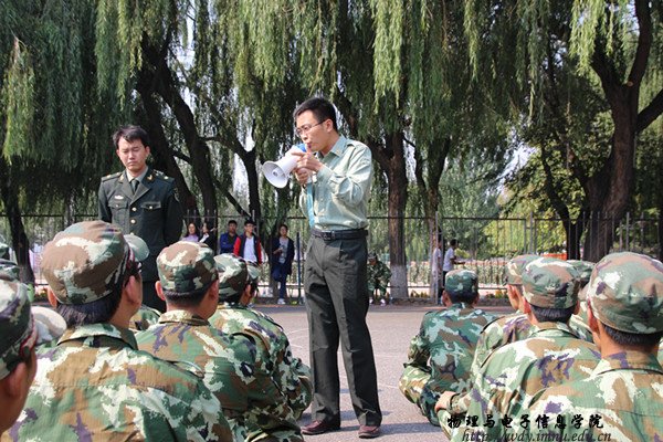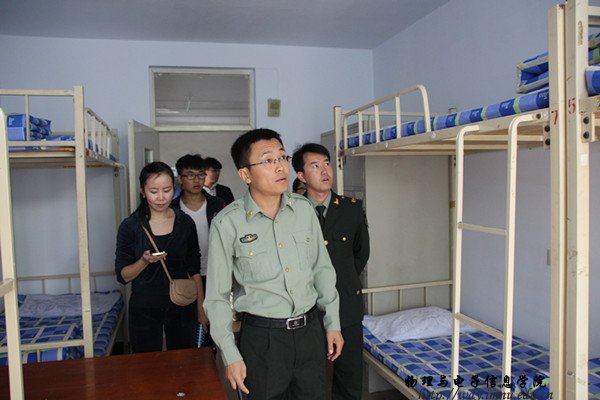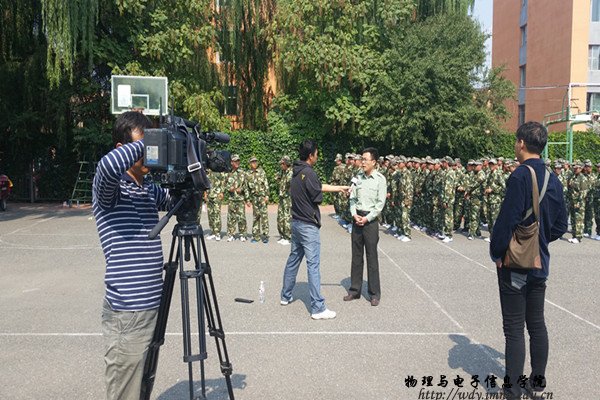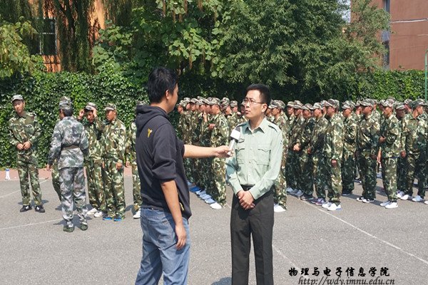 本网讯 2015年9月15日上午,我院党总支副书记何小龙老师、团总支萨其尔老师和学工办宋志强老师对我院15级新生的军训情况进行了全面的视察。首先,老师们来到了新生宿舍,查看了每个宿舍的内务情况。期间,何老师明确指出了新生内务的问题所在。随后,老师们来到了新生的军训场地,何老师深入队伍,鼓励新生们积极完成军训任务,并就内务所出现的问题做出了明确的指示和指导,督促新生改正问题,精益求精。最后,内蒙古卫视的记者对何老师和几位参训同学进行了采访,访问中,何老师表示军训是大学生成长成才的起点,是人生中宝贵的经历,相信我院新生一定能够圆满的完成军训任务!