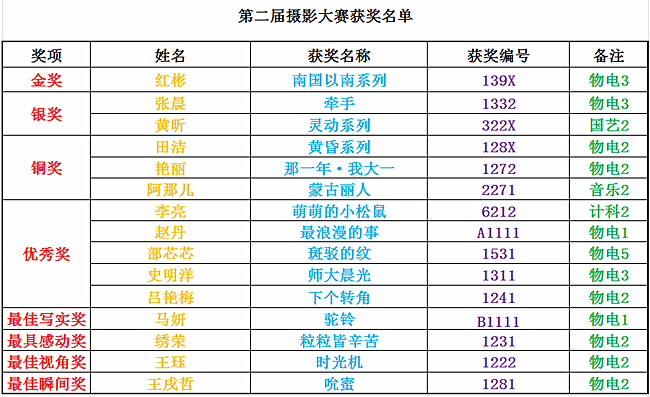 “麦克斯韦的光圈”摄影大赛成果简介:内蒙古师范大学物理与电子信息学院《麦克斯韦的光圈》第二届摄影大赛,大赛组委会紧紧围绕“三走”暨“四进四信”活动等上级相关精神指示,同时以突出“物电”特色为目标,首次启用全媒体互动技术助力该活动简洁、高效进行,整体活动经腾讯云分析,用户参与度达到4217人,微信公众平台用户活跃度净增21.3% ;由此可见,此次活动在全校范围内引起了热烈反响并且营造了良好的活动气氛,以广大师生喜闻乐见的方式吸引了我院内外广大师生的热情参与,包括收到了来自音乐、国艺、生科、化环等兄弟学院大批优秀作品投稿,总收集作品数达到527张,后经严格筛选确定90张作品参与到投票环节,最终确定产生了金奖一名、银奖两名、铜奖三名、最佳奖和优秀奖若干名的结果,并颁发独家定制水晶奖杯、奖牌、荣誉证书、作品证书等奖品。